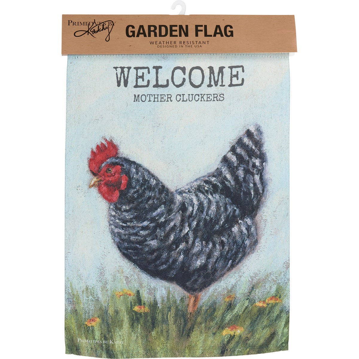 A double-sided polyester garden flag from our Farmhouse Collection displaying a charming hand painted design of a Plymouth Rock chicken with humorous "Welcome Mother Cluckers" sentiment. Design is replicated from original artwork painted onto burlap canvas, giving the art a unique depth and texture. Flag is weather-resistant and features an opening to hang on our Garden Flag Pole. Hand-wash only.