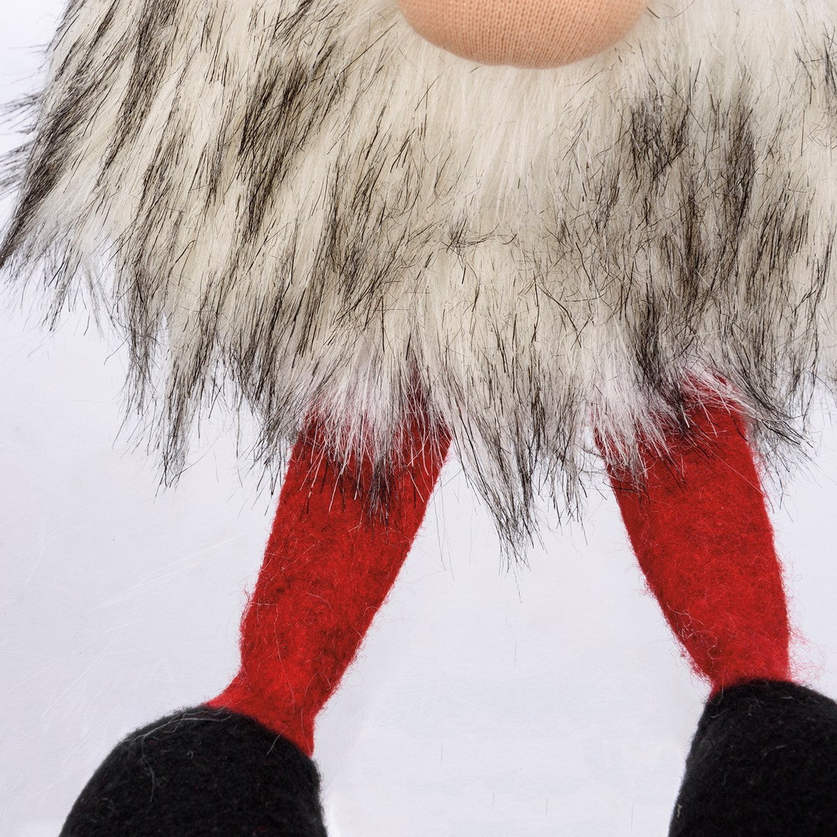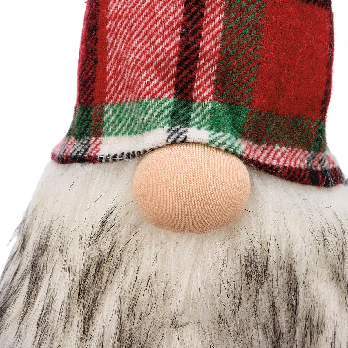 A felt gnome with hanging legs and a fabric hat featuring a Christmas plaid color palette.