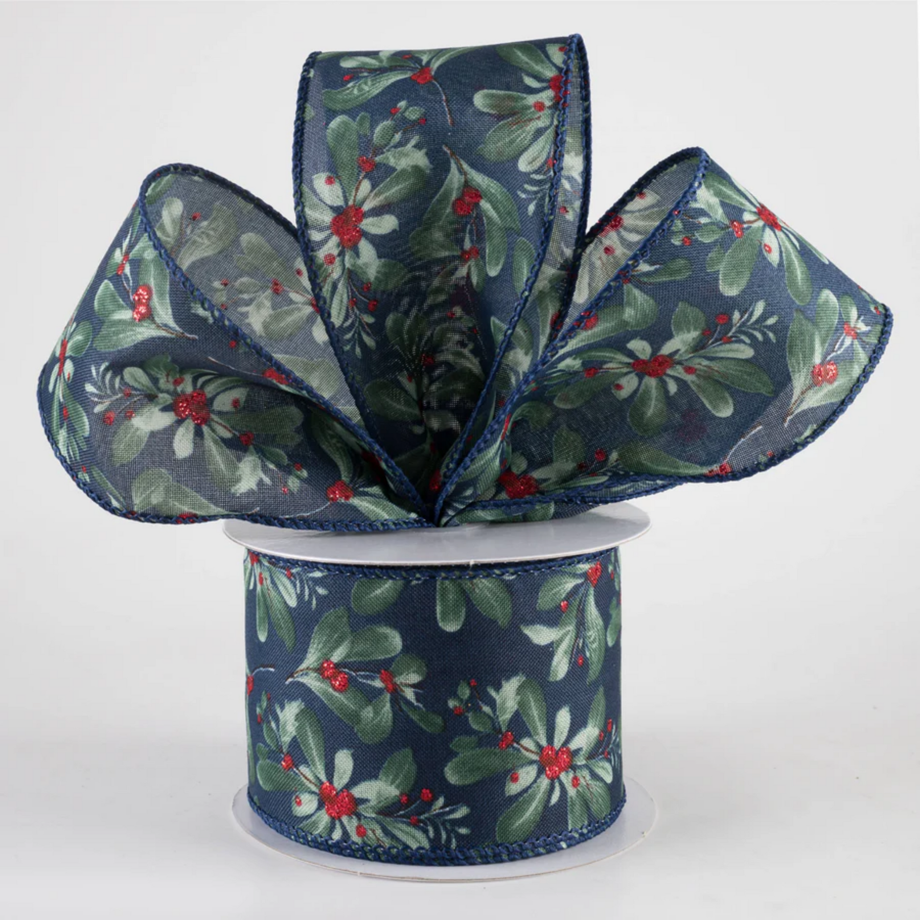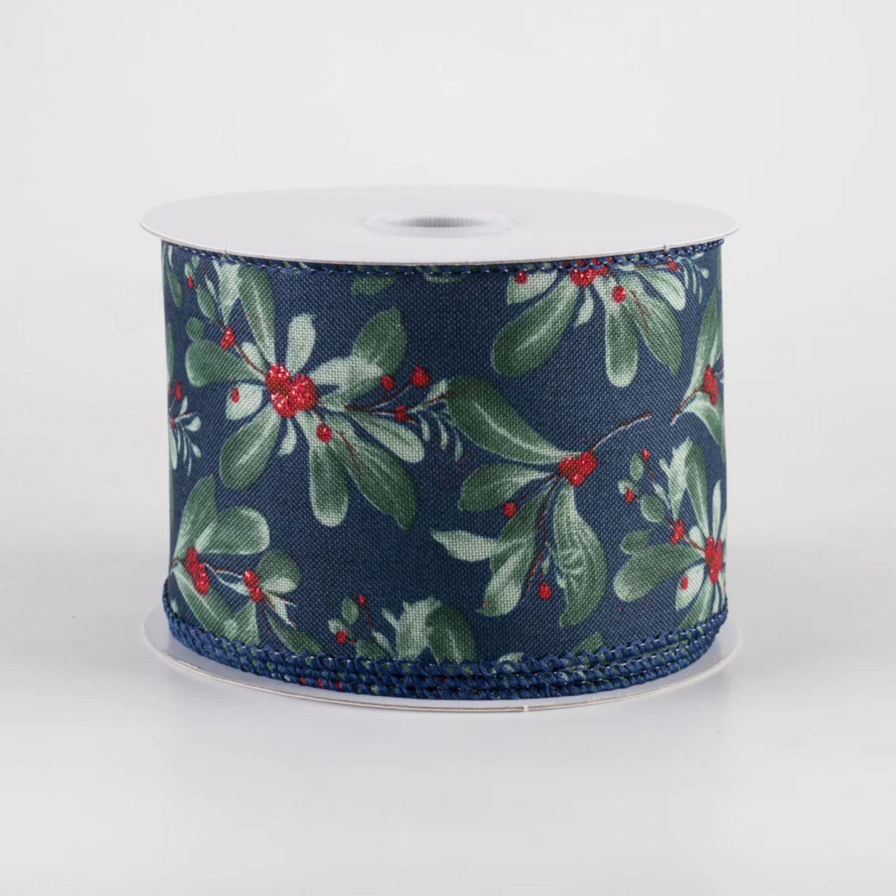 This navy blue ribbon has a pattern of green mistletoe sprigs that look like they were painted in watercolor. Each cluster of leaves has a few red berries that are dotted with red glitter.