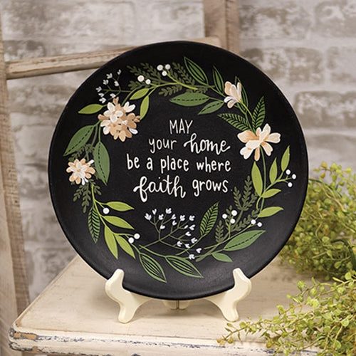 The Faith Grows Plate is a decorative, lightweight wooden plate with a black painted finish. The plate reads "May your home be a place where faith grows" in painted lettering and features a painted greenery wreath with cream floral blooms. Display this plate on a tabletop or wall using a plate holder to bring an inspiring touch to the everyday home.