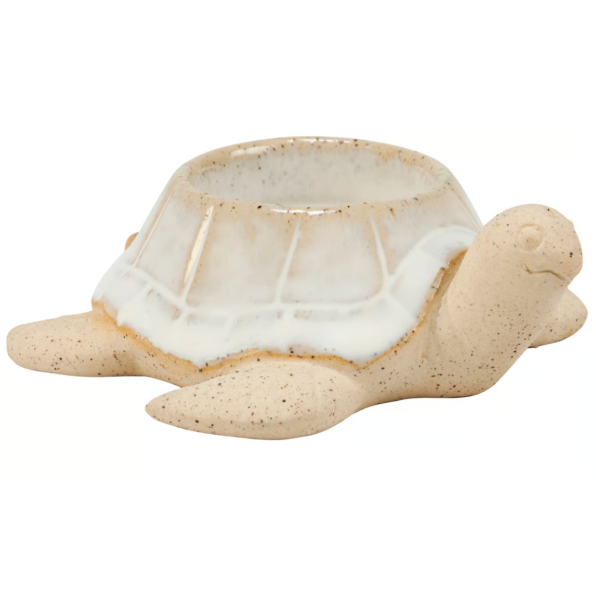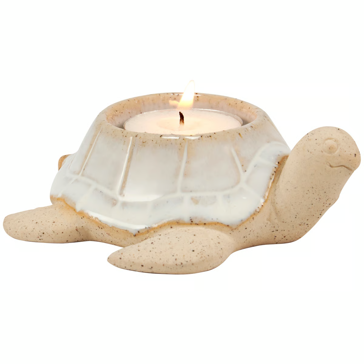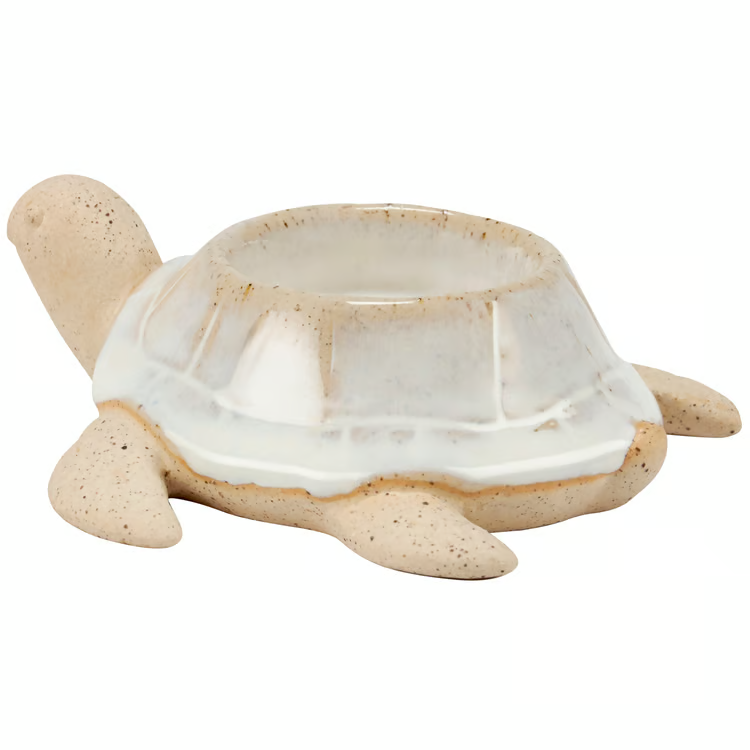 A ceramic candle holder that coordinates well with décor from our Beach Collection. Beach candle holder features a cream glaze and raw ceramic to create a charming sculpted turtle design and center slot on top of the shell for a single candle. Our Turtle candle holder fits a standard tealight candle and can free-stand on flat surface. Candle pictured not included. A fun beach-themed home accent perfect for adding natural lighting to any living space.