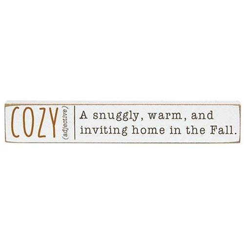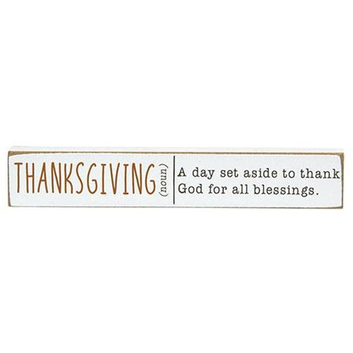 The Thanksgiving Mini Sticks are an assortment of three miniature wooden blocks with a white finish and distressed edges. The blocks feature orange and black lettering in a typed font. One block reads "Family (noun)", "loud people you love gathered around the Thanksgiving table." Another block reads "Cozy (adjective)", "a snuggly, warm, and inviting home in the Fall." The third block reads "Thanksgiving (noun)", "a day set aside to thank God for all blessings." These blocks can be displayed freestanding, perfect for a riser, tray, table, or shelf during Fall and Thanksgiving season.