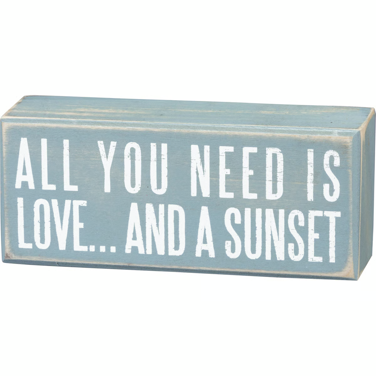 A wooden box sign featuring a distressed "All You Need Is Love... And A Sunset" sentiment in a beach-inspired palette. Complements well with existing decor or coordinating design pieces. Easy to hang or can free-stand alone on a shelf or mantel.