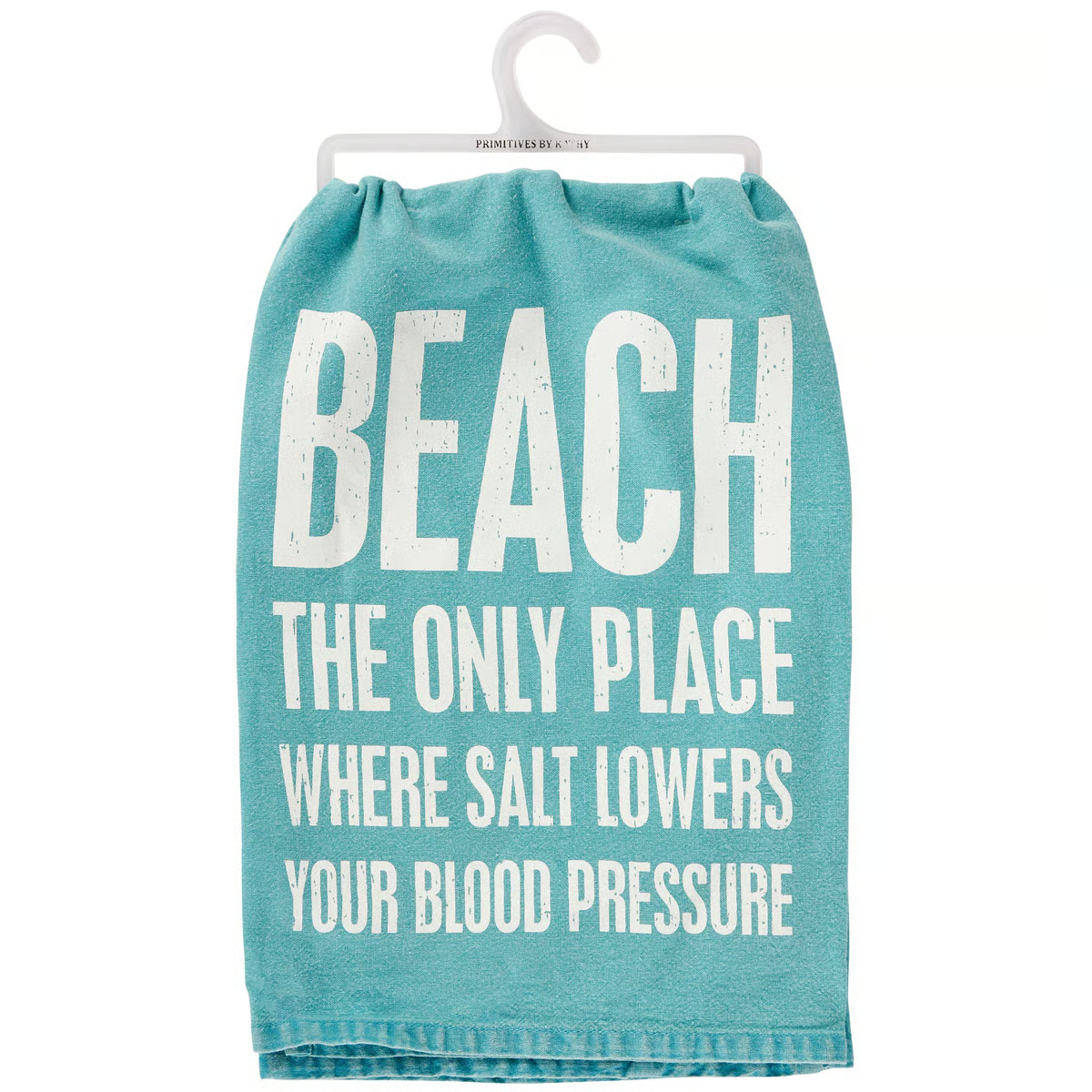 An ocean blue cotton kitchen towel from our Beach Collection displaying a fun beach inspired sentiment in a classic box sign style that reads "Beach - The Only Place Where Salt Lowers Your Blood Pressure." Our The Only Place kitchen towel is conveniently machine-washable for easy cleaning.