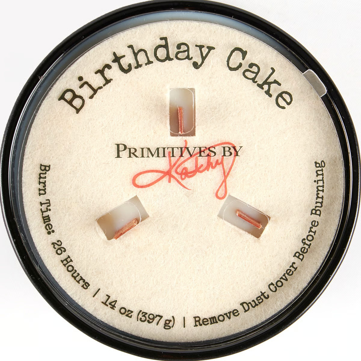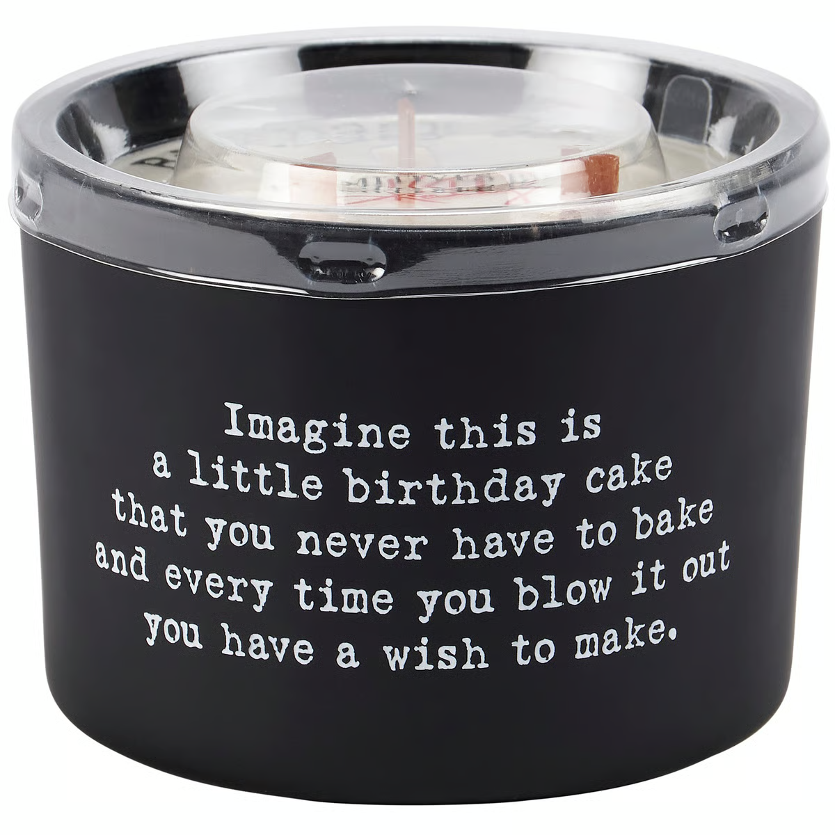 A candle from our Box Sign Style Collection displaying a birthday inspired poem in a typewriter style on matte black glass that reads "Imagine this is a little birthday cake that you never have to bake and every time you blow it out you have a wish to make." Poetry candle features soy-based wax and 3 wooden wicks with 26 hours of burn time activating a satisfying Birthday Cake scent. Our Birthday poetry candle includes a dust cover and plastic lid for protection and enhanced appearance on store displays. A fun birthday gift perfect for an everyday home accent.