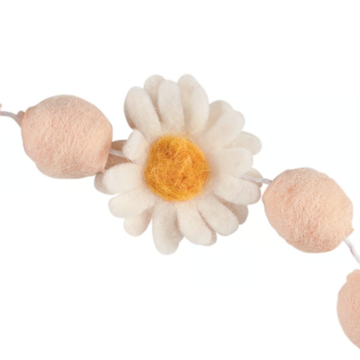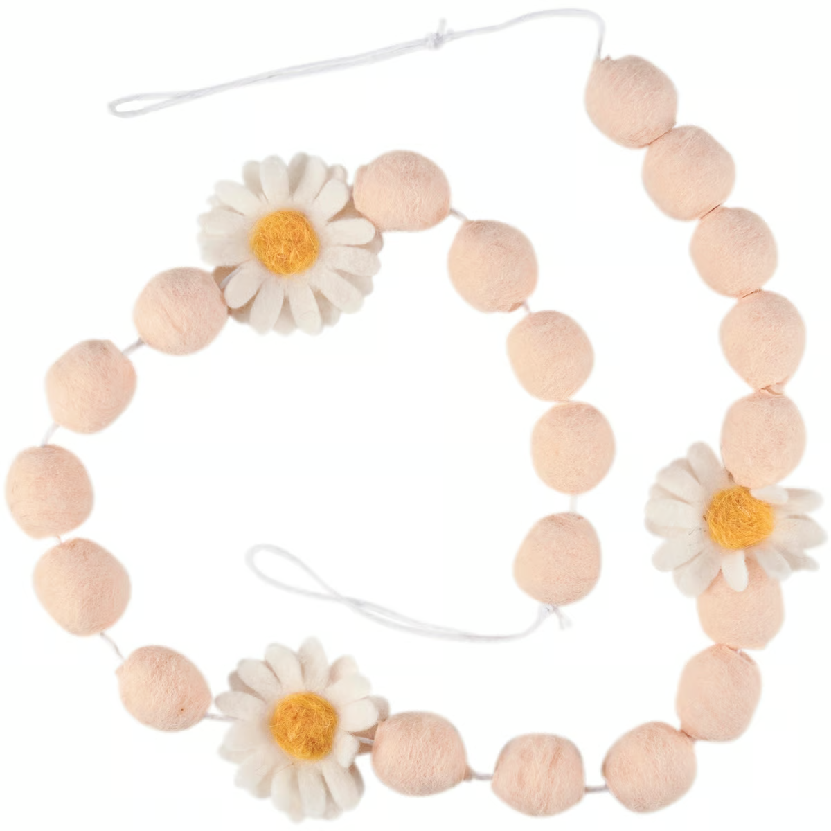 A decorative garland from our Garden Collection displaying felt daisies with pink felt poms along a white string. Garland features string loops at each end. Our Daisy garland includes 39.5 inches of length for plenty of coverage and is easy to hang via string loops. A daisy-themed everyday home accent with a variety of display options.