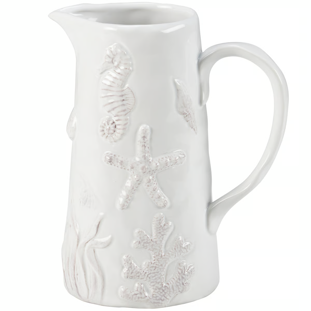A lightweight, but durable ceramic pitcher from our Beach Collection displaying a clean white glaze finish with embossed designs of various sea life and ocean plants around the outside. Embossed ocean designs feature textured detail. Our Beach pitcher is microwave, dishwasher, and food safe for convenient use. A piece of everyday tableware perfect for oceanic themed gatherings.