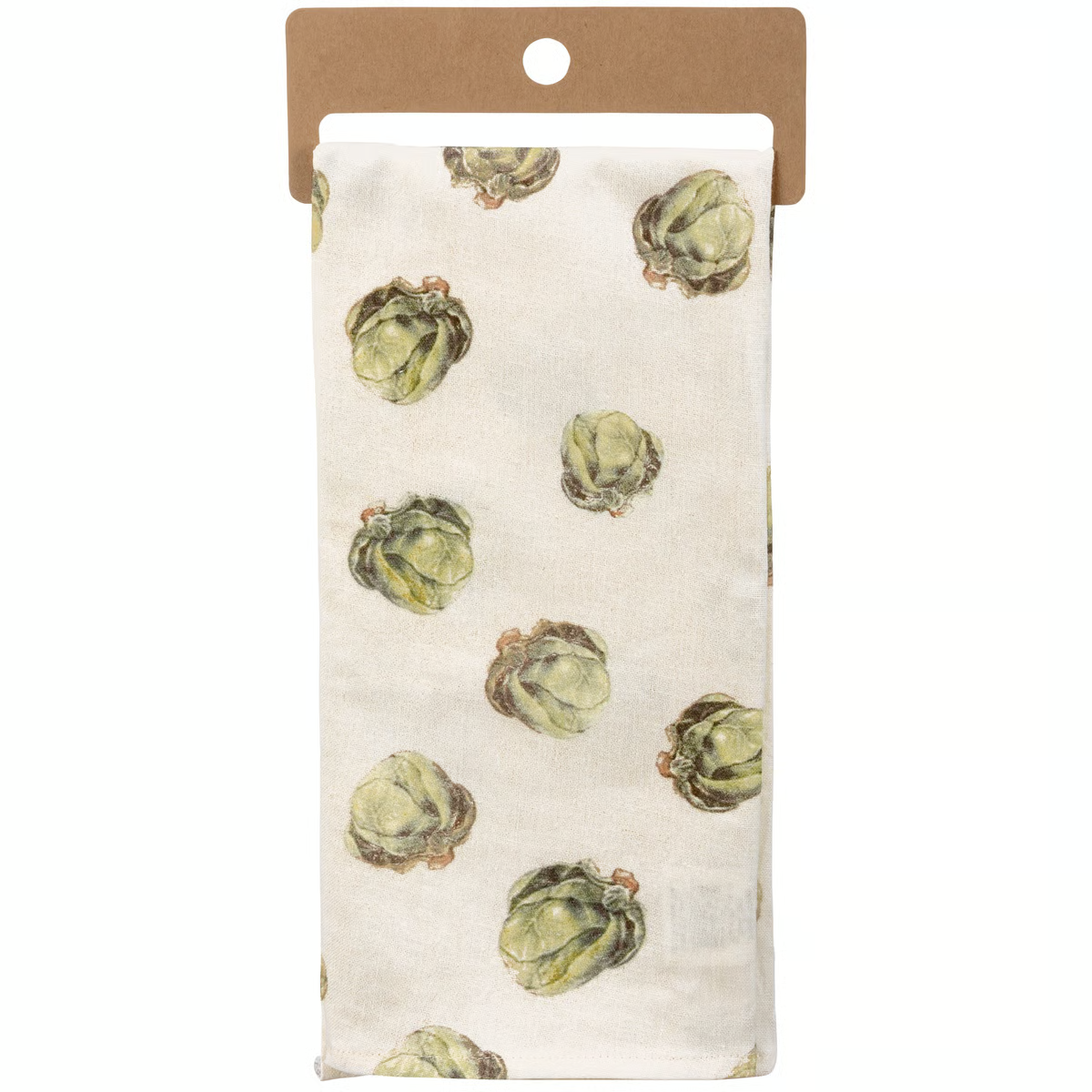A cotton linen blend kitchen towel featuring all-over retro style Brussels sprouts designs and punny embroidered "Every Day I'm Brusselin'" sentiment. Features a cotton tape loop in the corner for easy hanging. Machine-washable. Towel is packaged on a cardboard hanger with a hole to easily hang on rack.