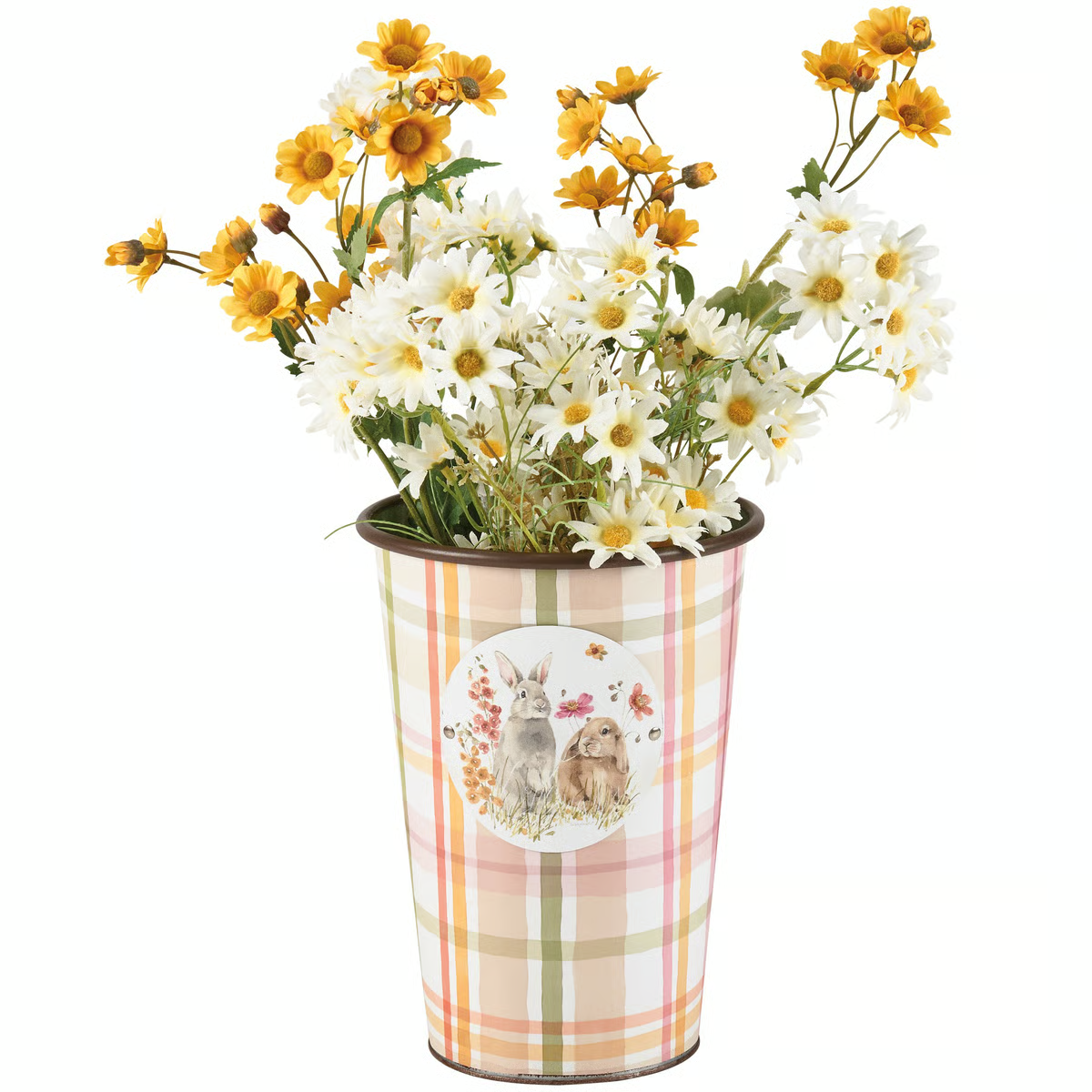 A decorative metal bucket from our Easter & Spring Collection displaying a wrap-around pattern of springtime inspired plaid. Bucket also features a hand painted design of bunnies with vibrant spring flowers on a medallion attached with rivets adding dimensional detail. Our Flower Bunnies bucket is perfect for storing gardening tools, displaying greenery, or including in an Easter display. Greenery pictured not included. A charming seasonal home accent with a variety of display options.