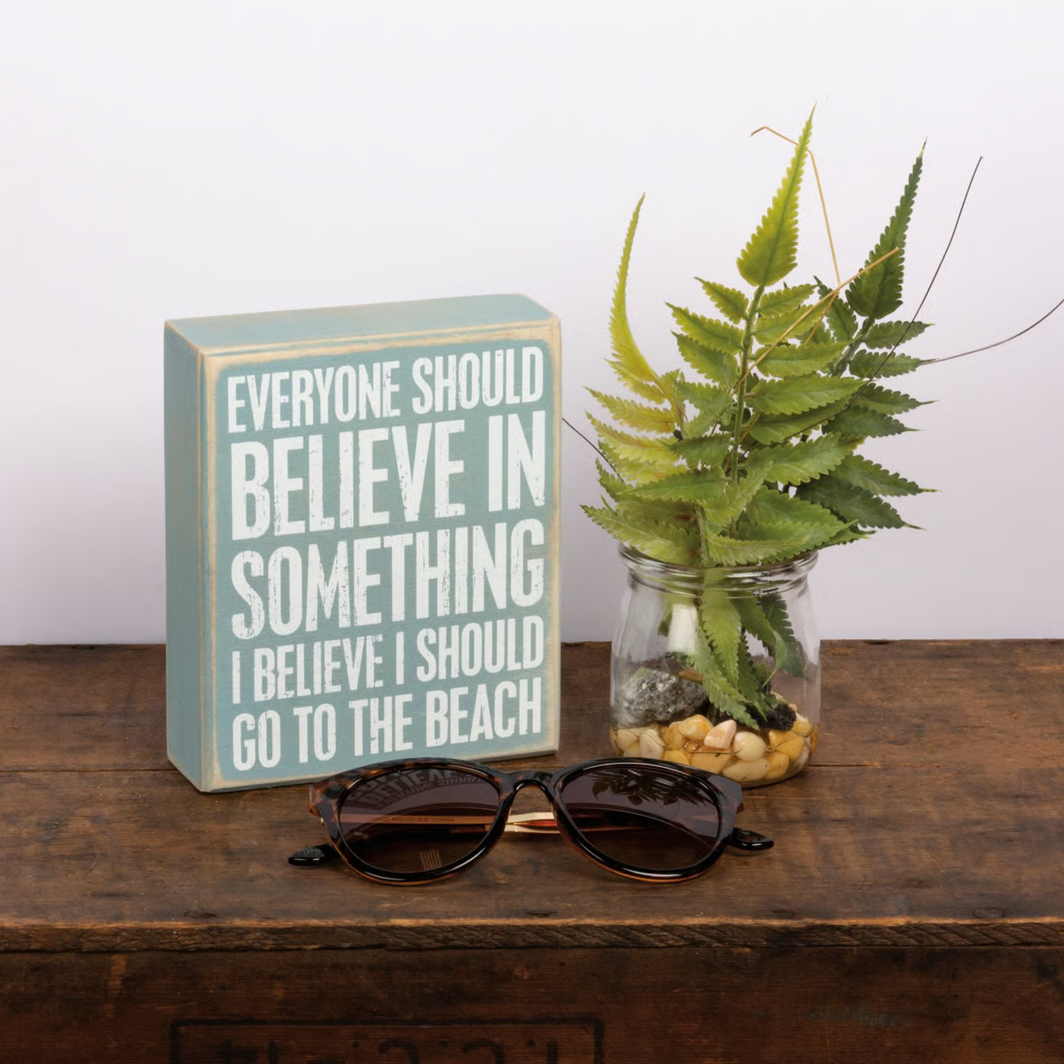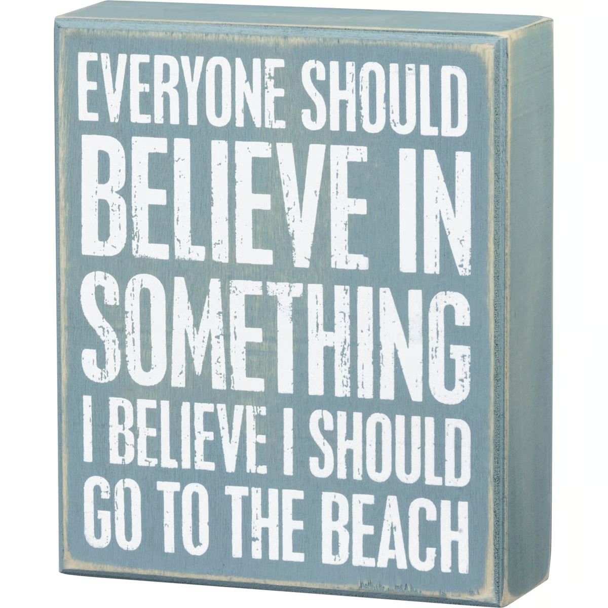 A wooden box sign featuring a distressed "Everyone Should Believe In Something - I Believe I Should Go To The Beach" sentiment in a beach-inspired palette. Complements well with existing decor or coordinating design pieces. Easy to hang or can free-stand alone on a shelf or mantel.