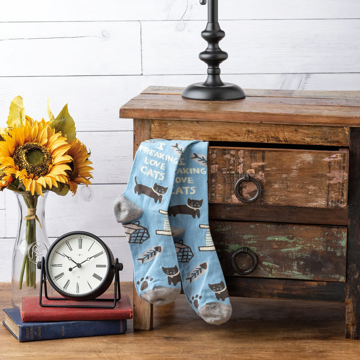 These colorful socks feature woven block print designs with coordinating "I Freaking Love Cats" sentiment. Cotton, nylon, spandex. One size fits most.
