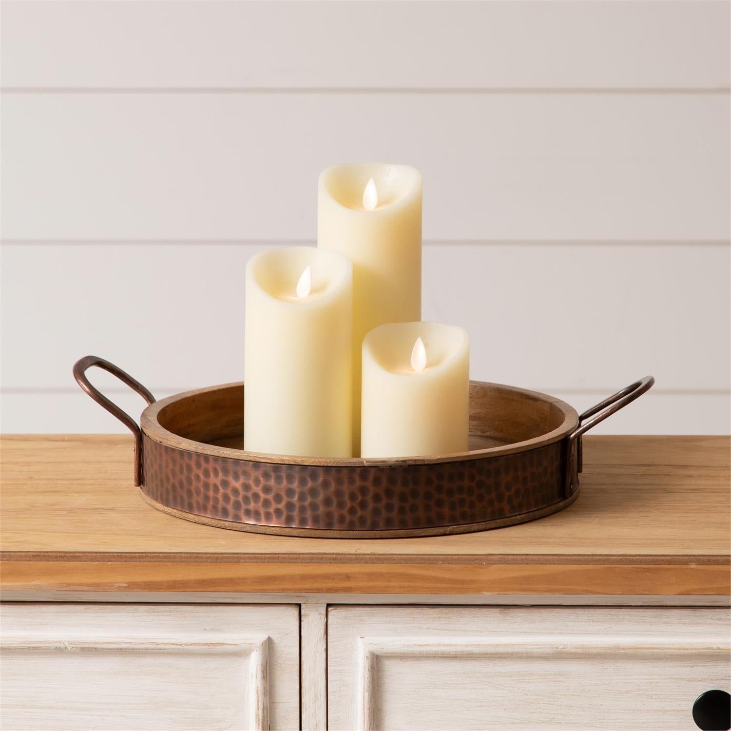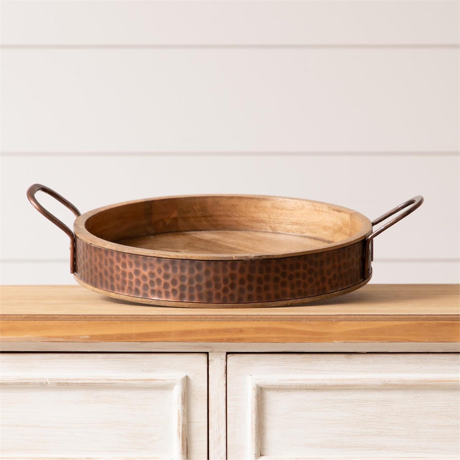 Round Wood With Dimpled Coppertone Metal Tray combines warm natural wood with a textured coppertone metal rim for a rustic yet refined look. Perfect for serving, styling coffee tables, or creating seasonal displays, this versatile tray adds rich texture and farmhouse charm while blending beautifully with rustic, industrial, and everyday décor styles.