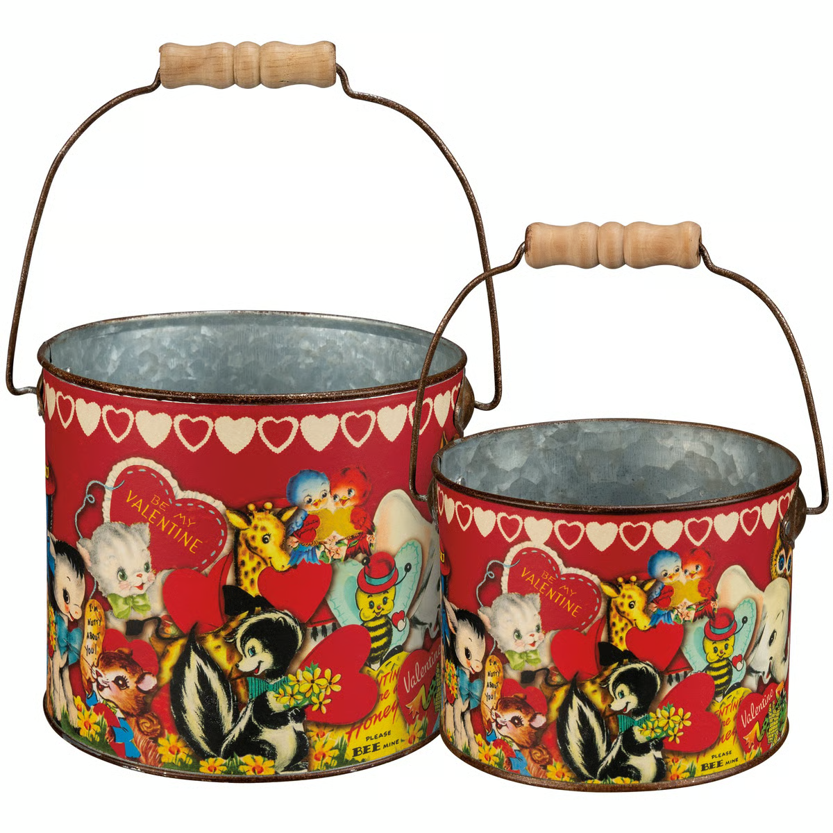 A set of two metal buckets featuring full wrap-around vintage Valentine's Day animal designs. Buckets include "Be My Valentine" sentiment. Contains metal handles with wooden grips for easy carrying.