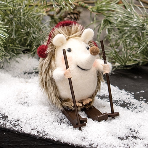 The Skiing Hedgehog Felted Ornament is a playful decorative figure perfect for a holiday tree or other hanging decor. Made with a white felt finish, the ornament depicts a hedgehog standing on his back feet on a pair of wooden skis. Long, dimensional brown fur covers the hedgehog's back and he wears a pair of dark red earmuffs. A detailed face featuring rounded ears, black bead eyes, flushed pink cheeks, and a long nose with a brown pom tip gives the hedgehog a friendly look. He holds a pair of ski poles and hangs from a clear string.