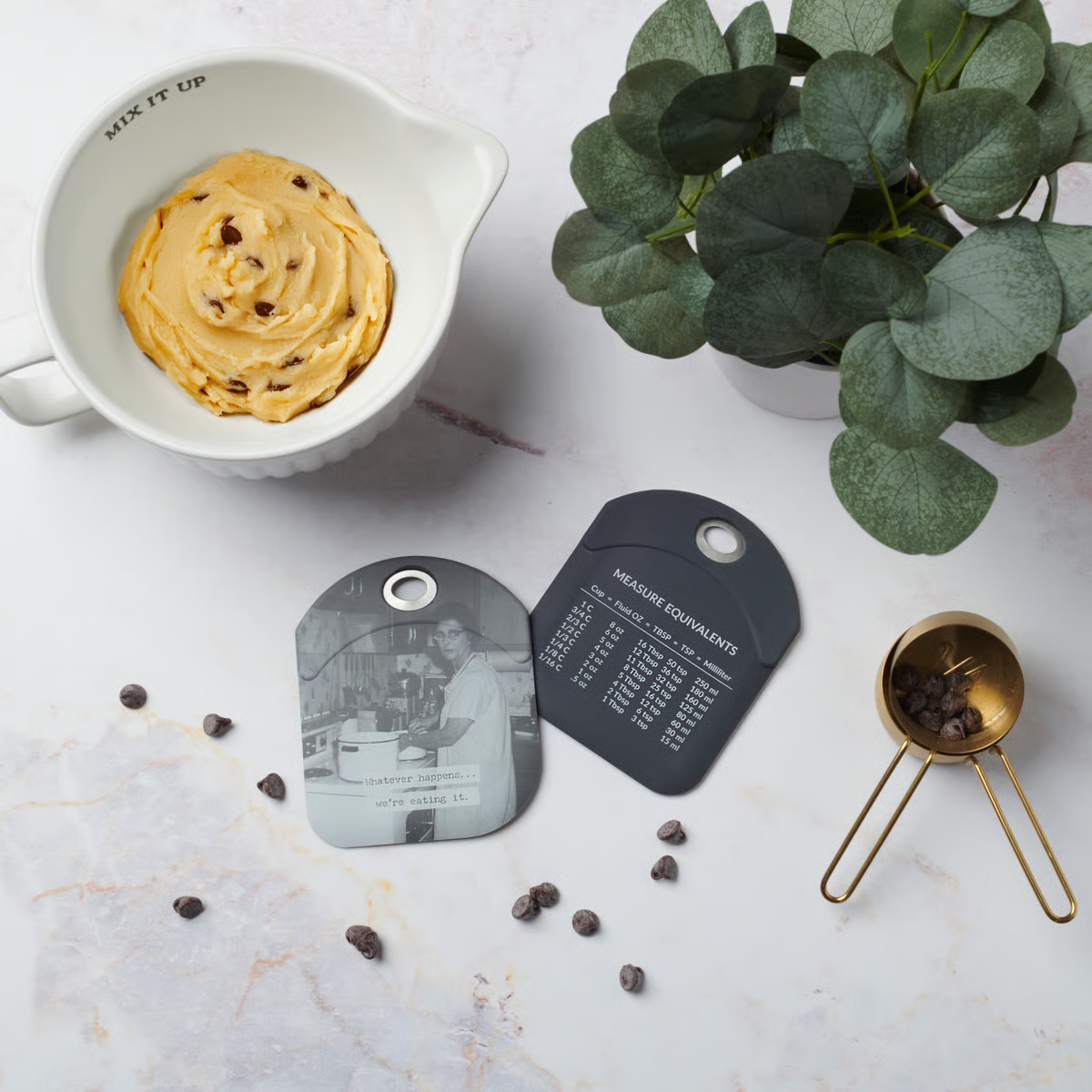 A double-sided silicone bowl scraper from our Trash Talk By Annie Collection displaying a vintage black and white photograph complemented with a humorous sentiment that reads "Whatever Happens... We're Eating It." Our We're Eating It bowl scraper features a sturdy stainless steel handle and convenient measurement equivalents on the back for easier baking. Silicone bowl scraper is hand wash only. A fun retro style kitchen accessory great for gifting.