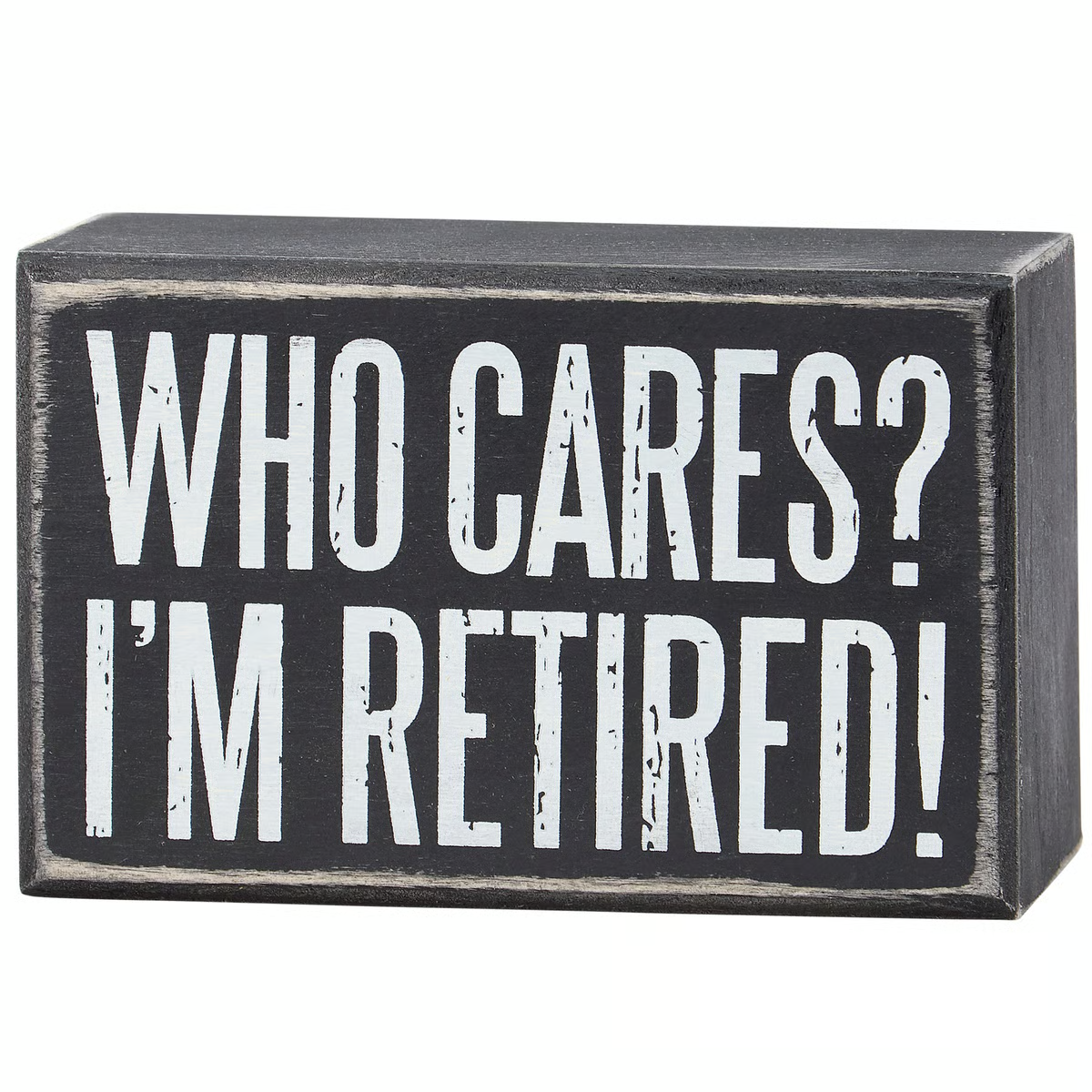 A classic black and white wooden box sign from our Retirement Collection displaying a humorous retirement inspired sentiment that reads "Who Cares? I'm Retired!" Funny box sign features distressed details with coordinating black color on sides and back. Our Who Cares I'm Retired box sign is easy to hang or can free-stand alone. A funny retirement gift that can be easily displayed in any home or recreational space.