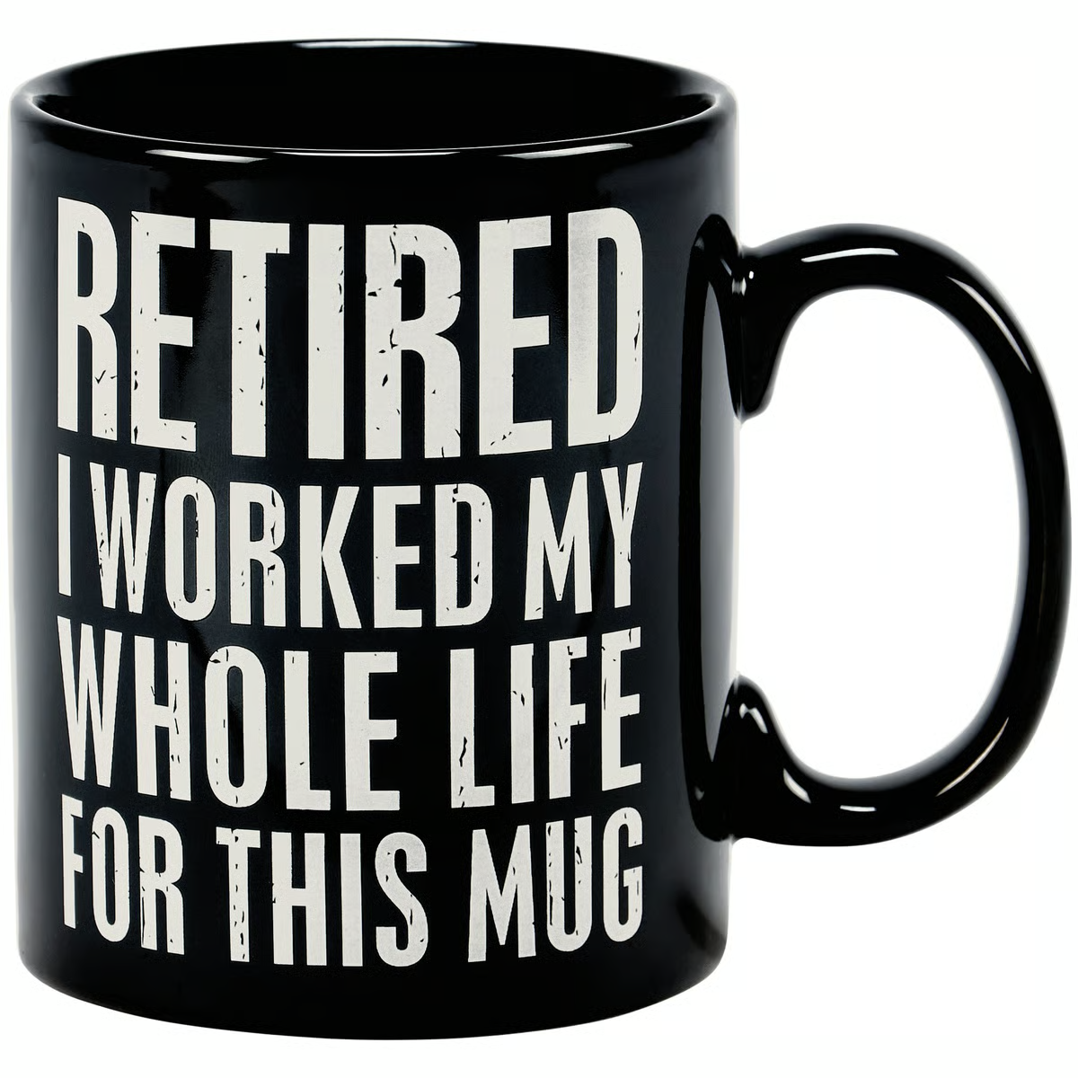 A stoneware 20 oz mug from our Box Sign Style Collection displaying a double-sided design of a fun retirement inspired sentiment in a classic box sign style that reads "Retired - I Worked My Whole Life For This Mug." Our I Worked For This mug is conveniently microwave, oven, dishwasher, and food safe for easy use. A fun retirement gift perfect for everyday drinkware.
