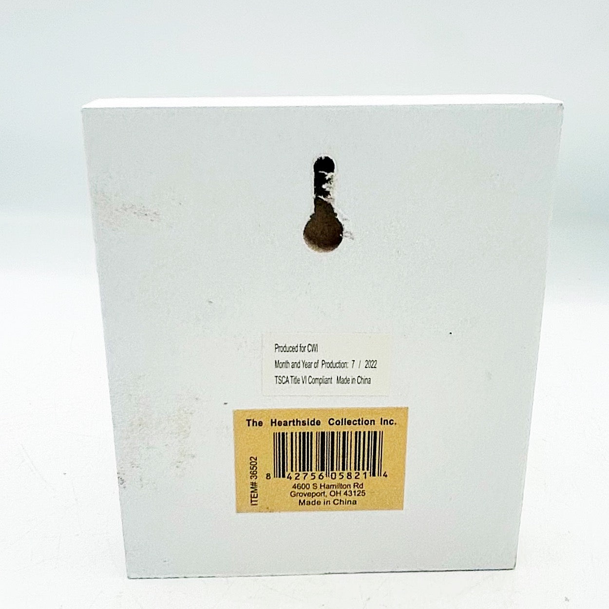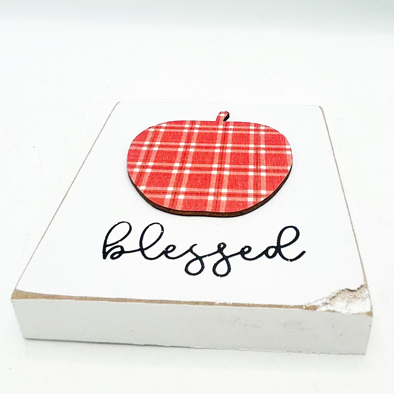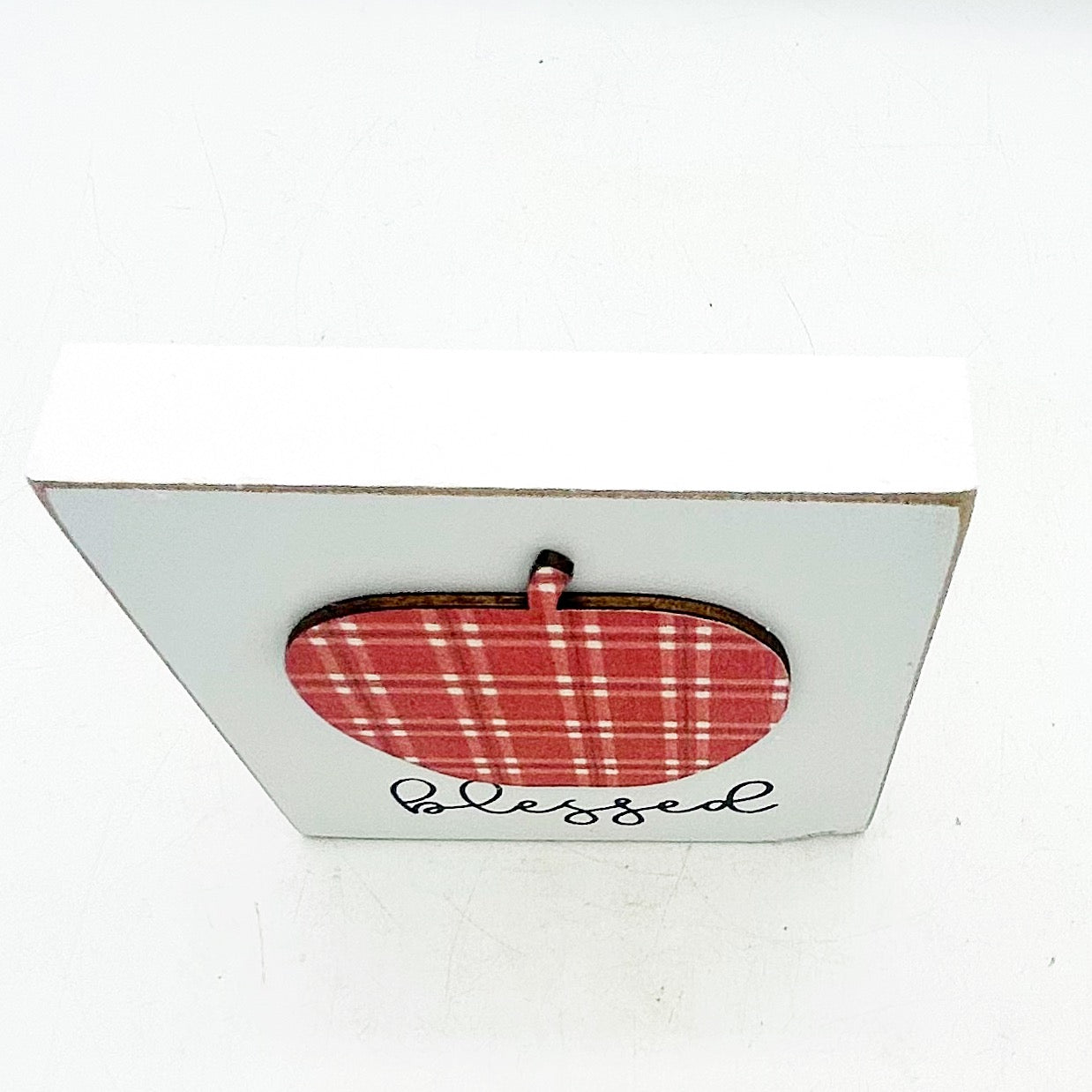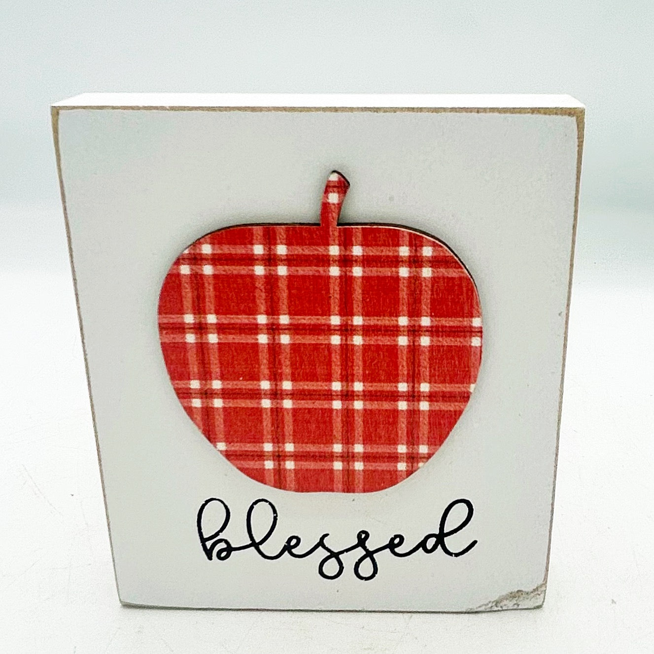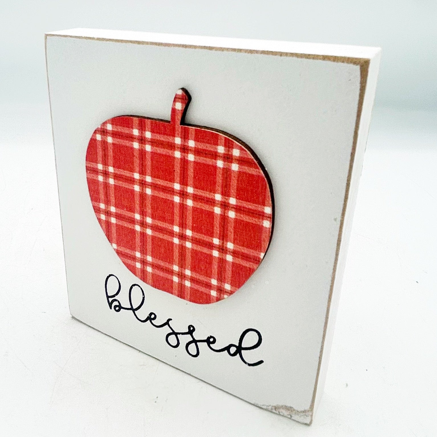 The Blessed Plaid Apple Block is a decorative wooden sign with a white finish and natural worn edges. The block reads "blessed" in simple black scripted lettering and displays a wooden apple cutout in a red plaid pattern. This block makes a wonderful gift and is a sweet addition to the home, displayed on a wall using the keyhole hanger or placed freestanding on a riser, tabletop, or shelf.