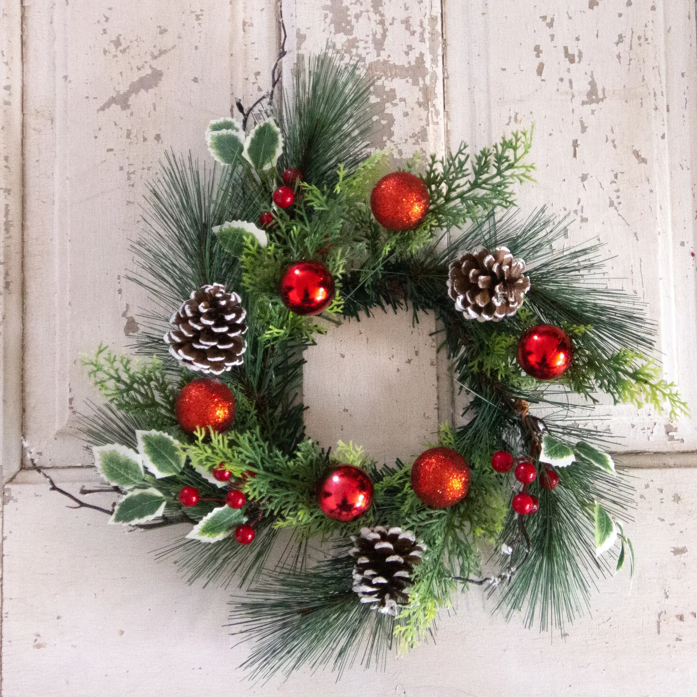 White Pine with Red Ornaments 14.5" Faux Evergreen Christmas Small Wreath