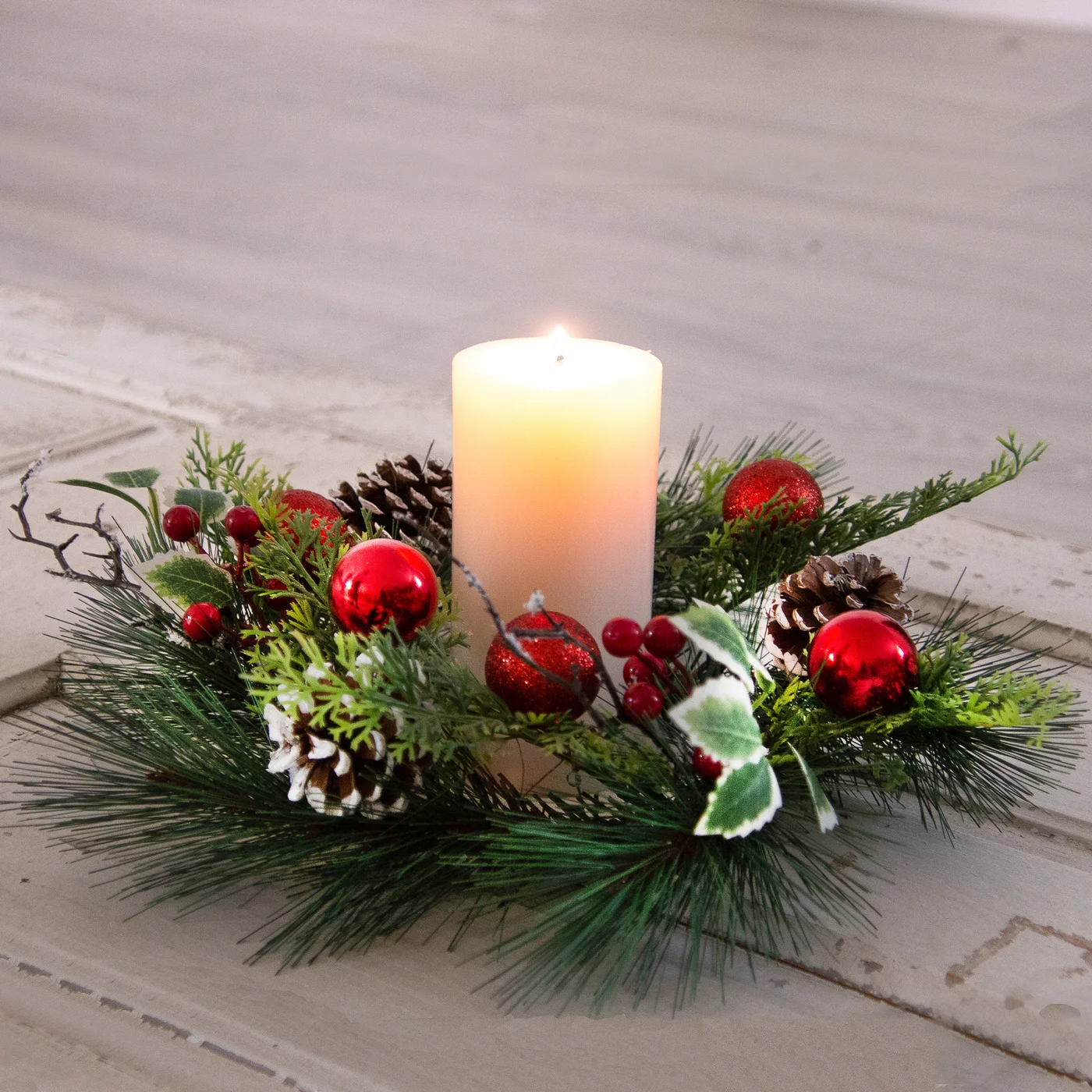 This holiday season, adorn your home with our charming White Pine and Red Ornaments Faux Evergreen Christmas Wreath. Made with realistic materials, it adds a touch of elegance to any room. Measuring 14.5", it's perfect for smaller spaces. Experience the joy of the season with this festive wreath.