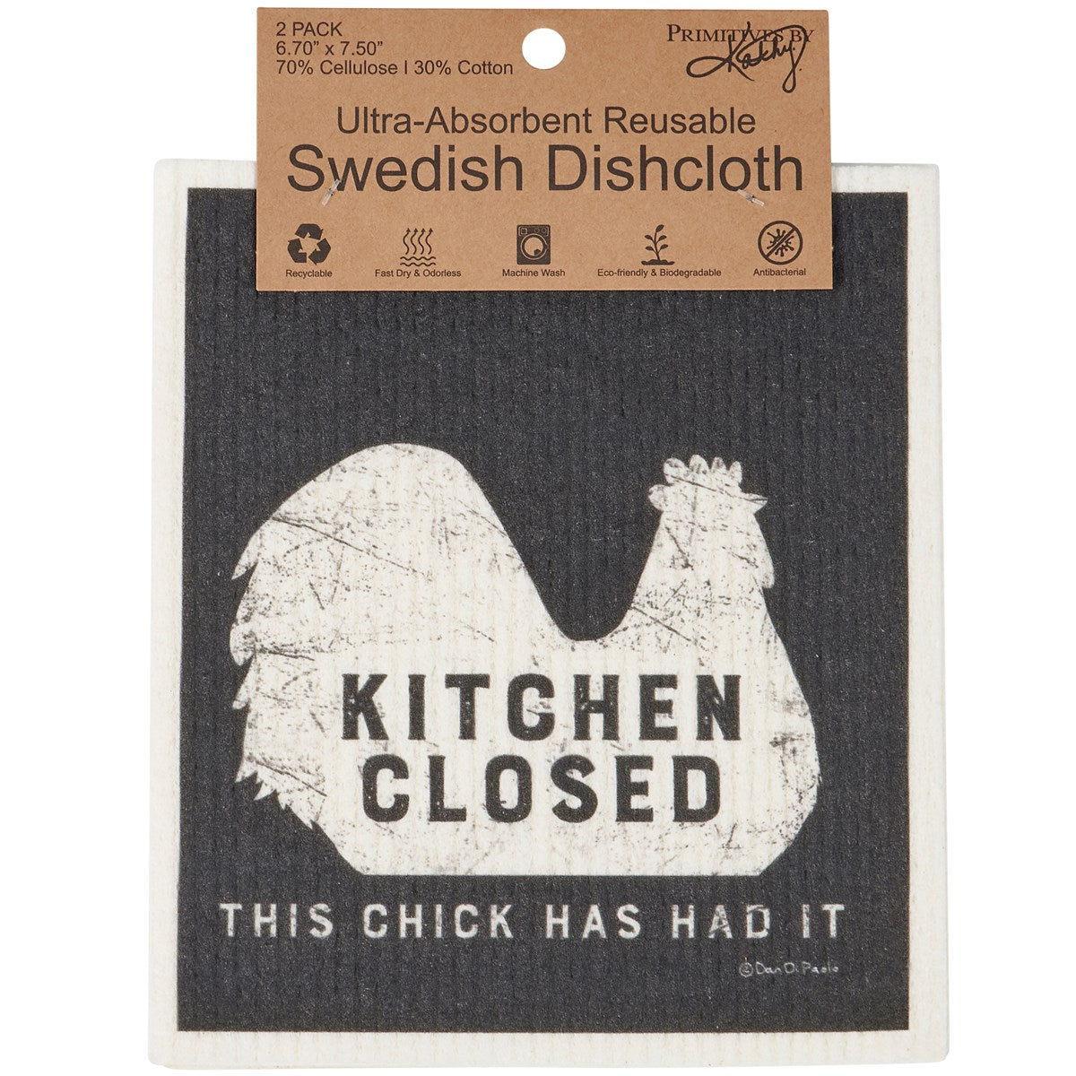 Safe to use on all types of surfaces, eco-friendly Swedish Dishcloths dry quickly and are antibacterial for more hygienic cleaning with reduced waste. This set of two Swedish Dishcloths from our Farmhouse Collection features rustic black and white designs with farm-themed sentiments. Designs include a chicken with a "Kitchen Closed - This Chick Has Had It" sentiment on one dishcloth and chickens above a "Sometimes You Just Gotta Say Cluck It And Walk Away" sentiment on the other dishcloth. Our Kitchen Is Closed Swedish Dishcloth set is machine-washable for convenient cleaning. An farm-themed set of reusable dishcloths perfect for replacing dull sponges and paper towels with long-lasting colorful designs.