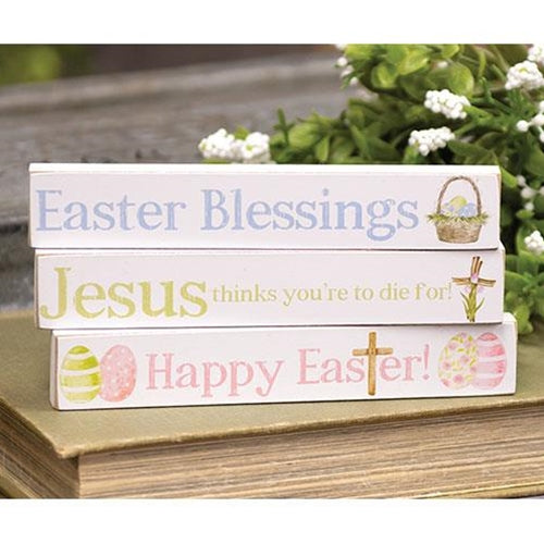 The Jesus Mini Sticks are an assortment of three petite decorative white wooden quote sticks with natural worn edges and a pastel Easter theme. One stick reads "Jesus thinks you're to die for!" in pastel green lettering with a cross and tulip art. Another stick reads "Easter Blessings" in sky-blue lettering and displays a basket filled with pastel Easter eggs. The third stick reads "Happy Easter!" in light pink lettering and displays pastel Easter eggs and a wooden cross. These sticks make great festive and inspirational additions to the home and can be displayed on any shelf, tabletop, riser, windowsill, or other flat surface.
