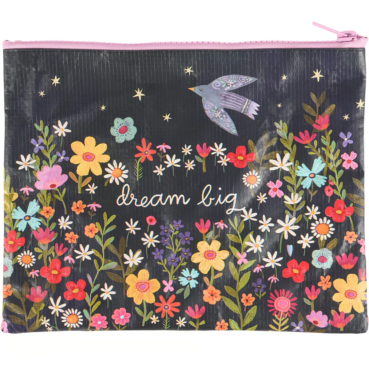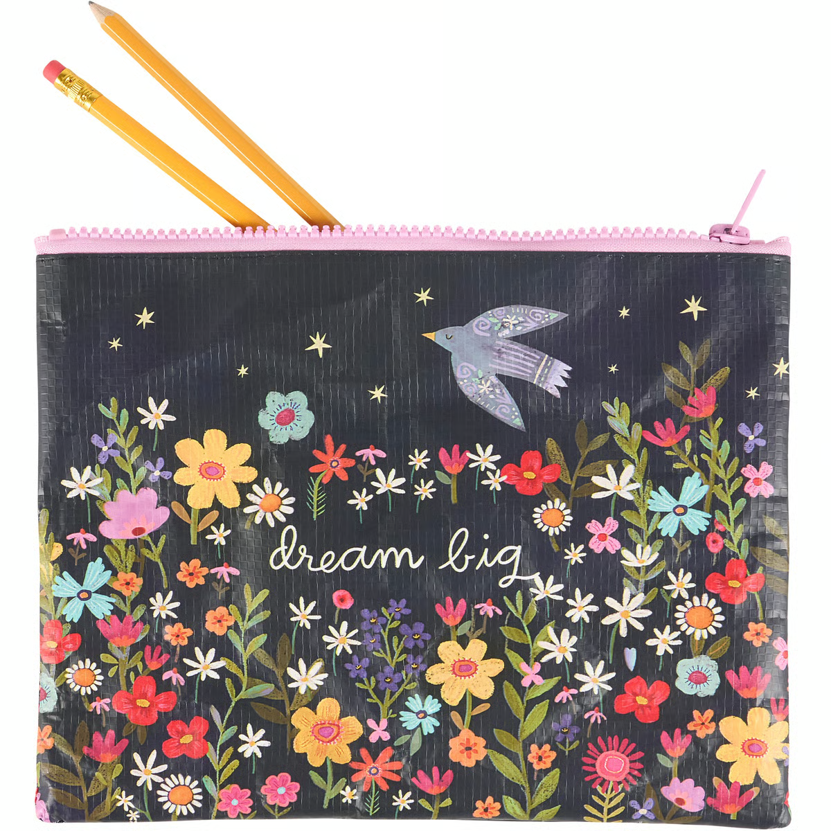 A double-sided zipper pouch from our Inspiration & Blooms Collection displaying vibrant hand illustrated designs of flowers and a bird with an inspirational sentiment that reads "Dream Big." Includes a top zipper closure in a coordinating pink color for easily securing items inside. Our Dream Big zipper pouch is made from eco-friendly post-consumer material and is perfectly sized to hold writing utensils, makeup accessories, money, and more! Accessories pictured not included. A inspirational accessory perfect for on the go organization.