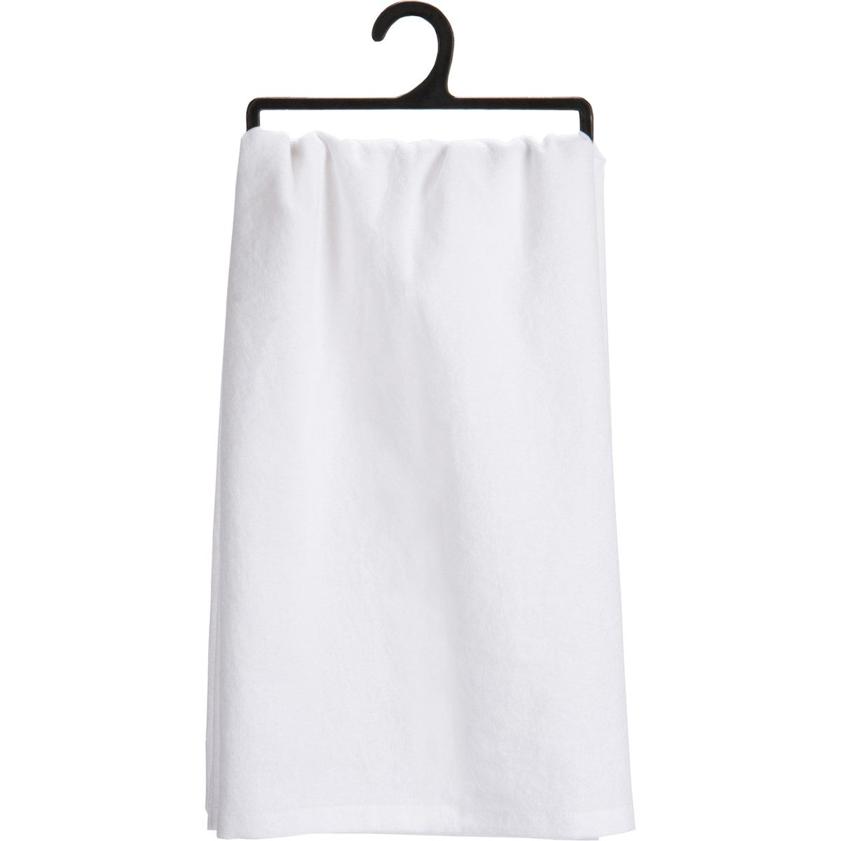 A black and white cotton kitchen towel from our Grilling & Chilling Collection displaying a unique hand illustrated design of a dog watching a person grilling above a fun grilling-themed sentiment that reads "Every Burger You Flip, Every Chip You Dip, I'll Be Watching You." Our Every Burger kitchen towel is machine-washable for convenient cleaning.