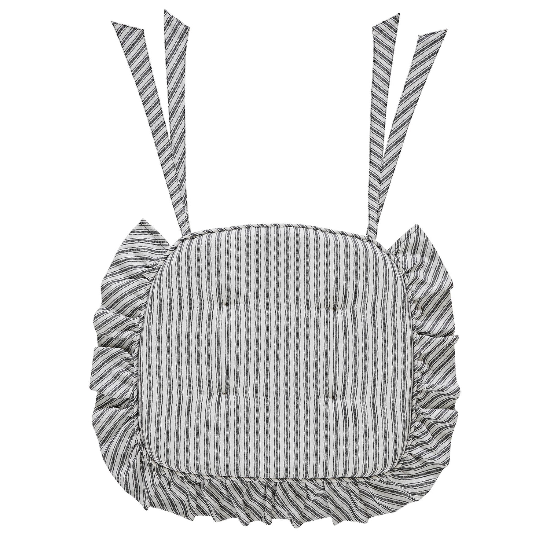Enhance your farmhouse and country-style home decor with the Chair Pad from the Sawyer Mill Black Collection in classic ticking stripes. Measuring 16.5x18 inches, this chair pad features a charming striped pattern that effortlessly blends with rustic aesthetics. Crafted from durable woven cotton, it offers both texture and enduring quality. Designed with practicality in mind, this chair pad includes secure ties to keep it in place, ensuring a comfortable and stable seating experience for your dining chairs or rocking chairs. T
