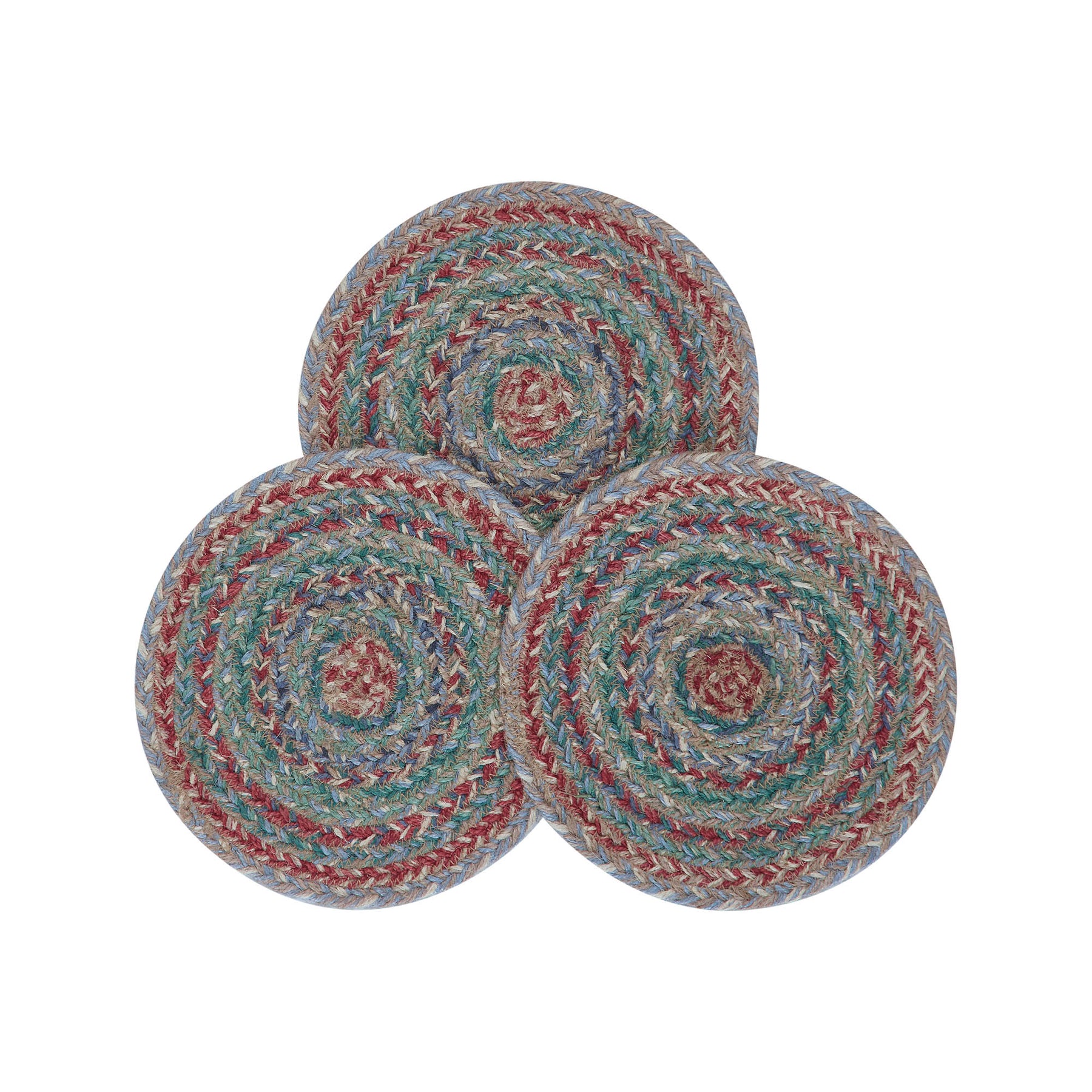 Create a joyful table for friends and family to gather round with modern color and classic texture while protecting dining tables from heat and moisture. The Multi Jute Trivet Set includes three circular, 8-inch trivets made from a premium Jute blend. The rich texture of braided jute is given a modern twist with blue, forest green, natural tan and garnet red colors for a bold country boho style.