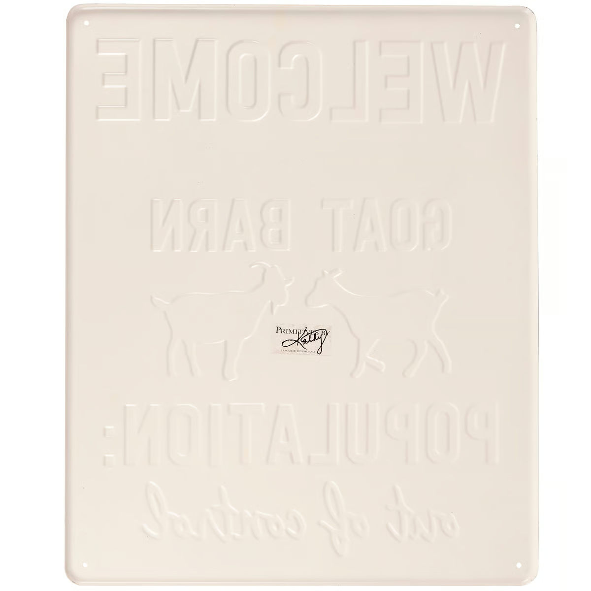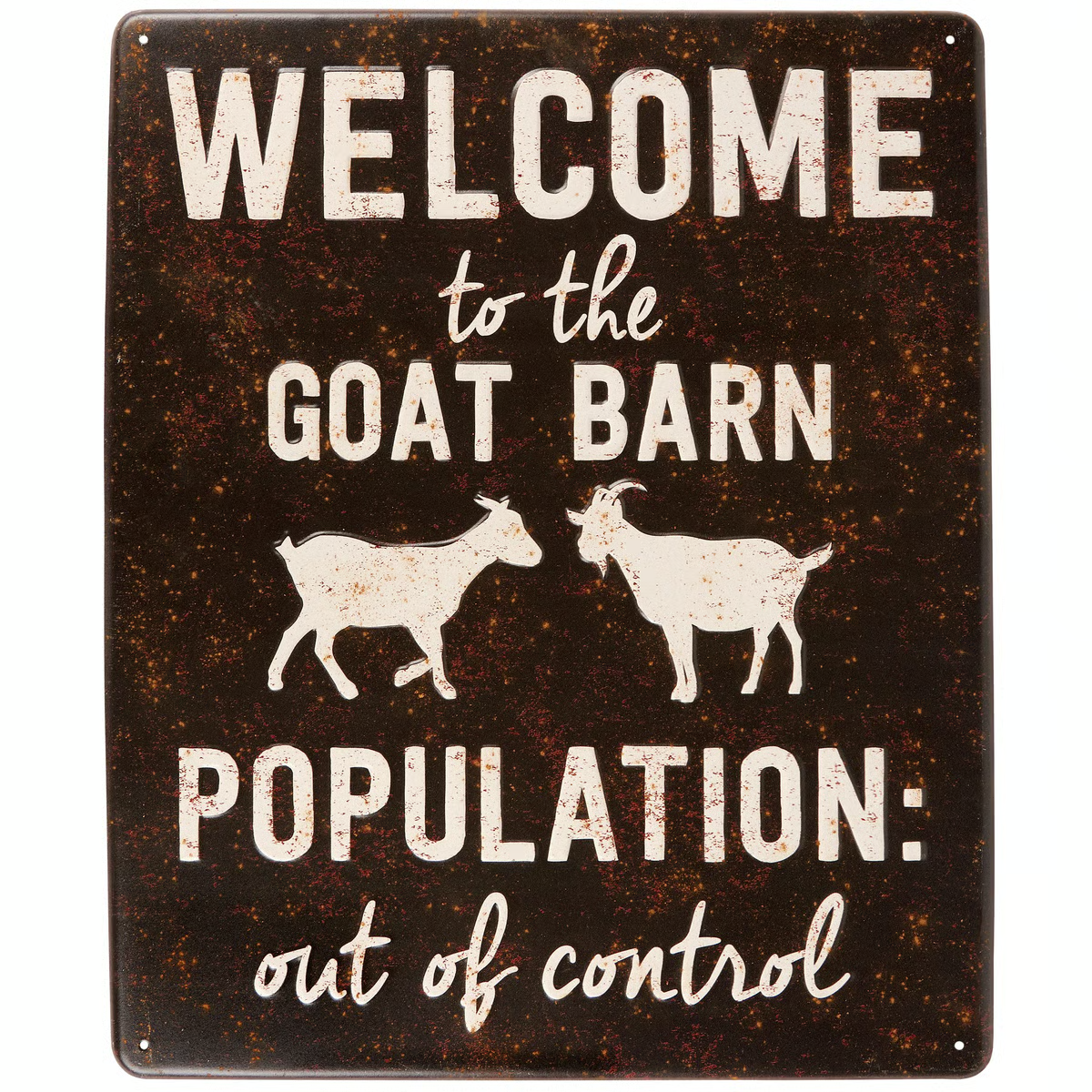 A metal wall décor piece from our Homestead Collection displaying goat silhouettes with a fun farm inspired sentiment that reads "Welcome To The Goat Barn - Population: Out Of Control." Farm sign design features embossed details and a rust finish for an aged appearance. Our Welcome To The Goat Barn metal wall décor is easy to hang against wall using the included mounting hardware and pre-drilled holes in each corner. A rustic farm-themed home accent perfect for everyday display.