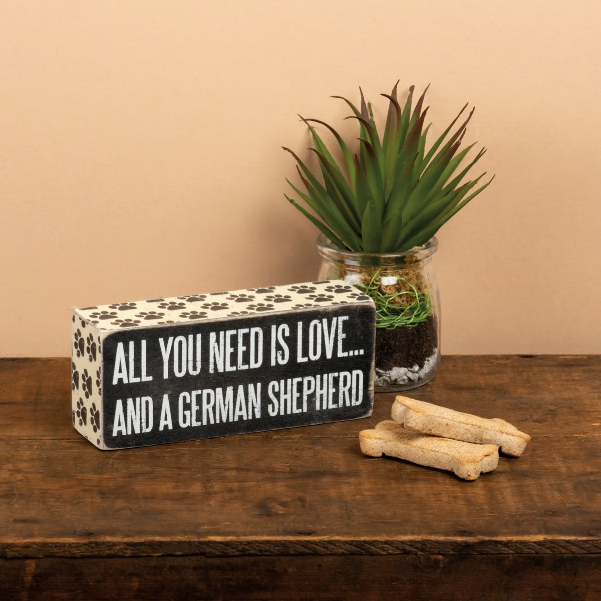 A wooden box sign lending a classic black and white a distressed "All You Need Is Love... And A German Shepherd" sentiment with paw print trim designs. Easy to hang or can free-stand alone.