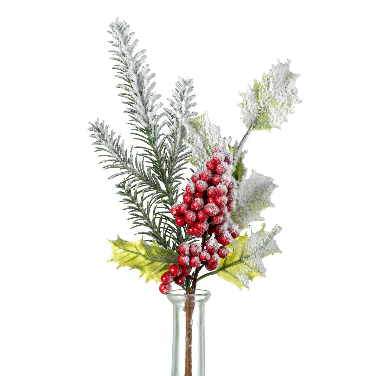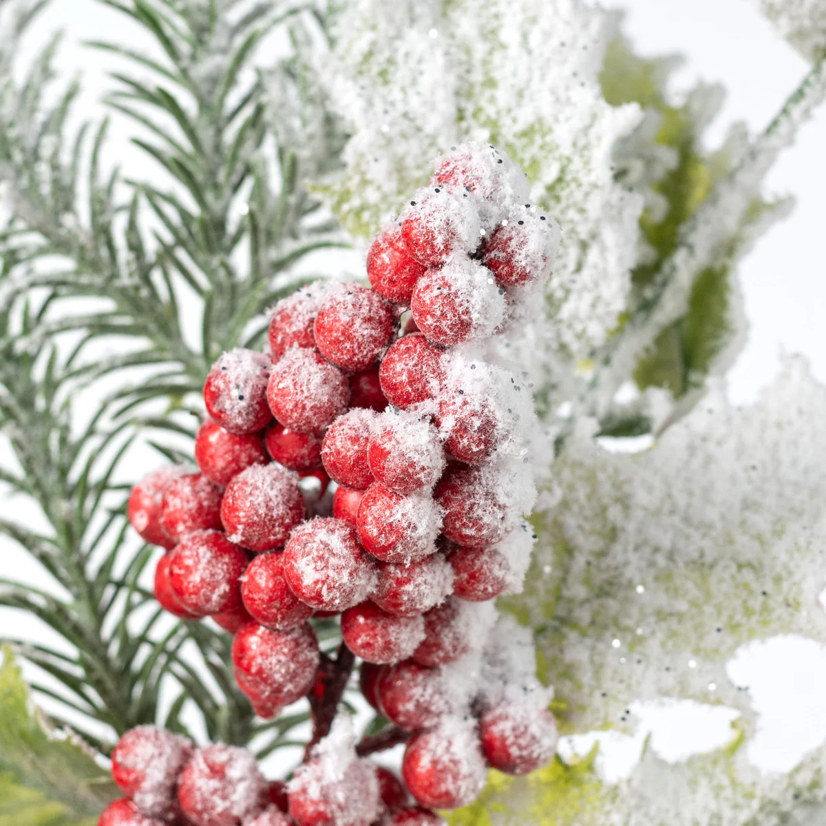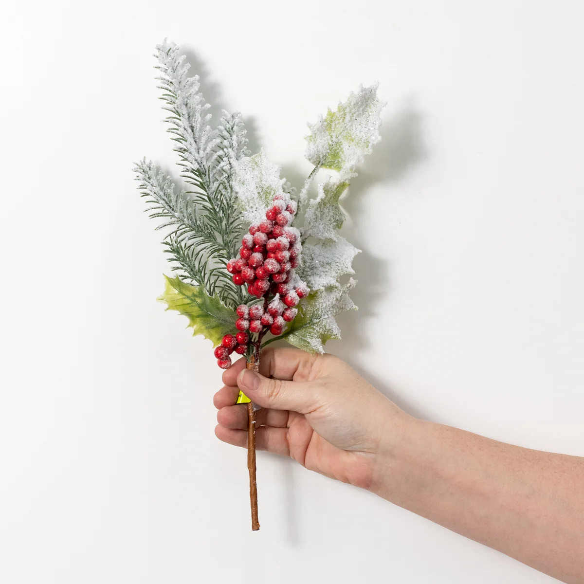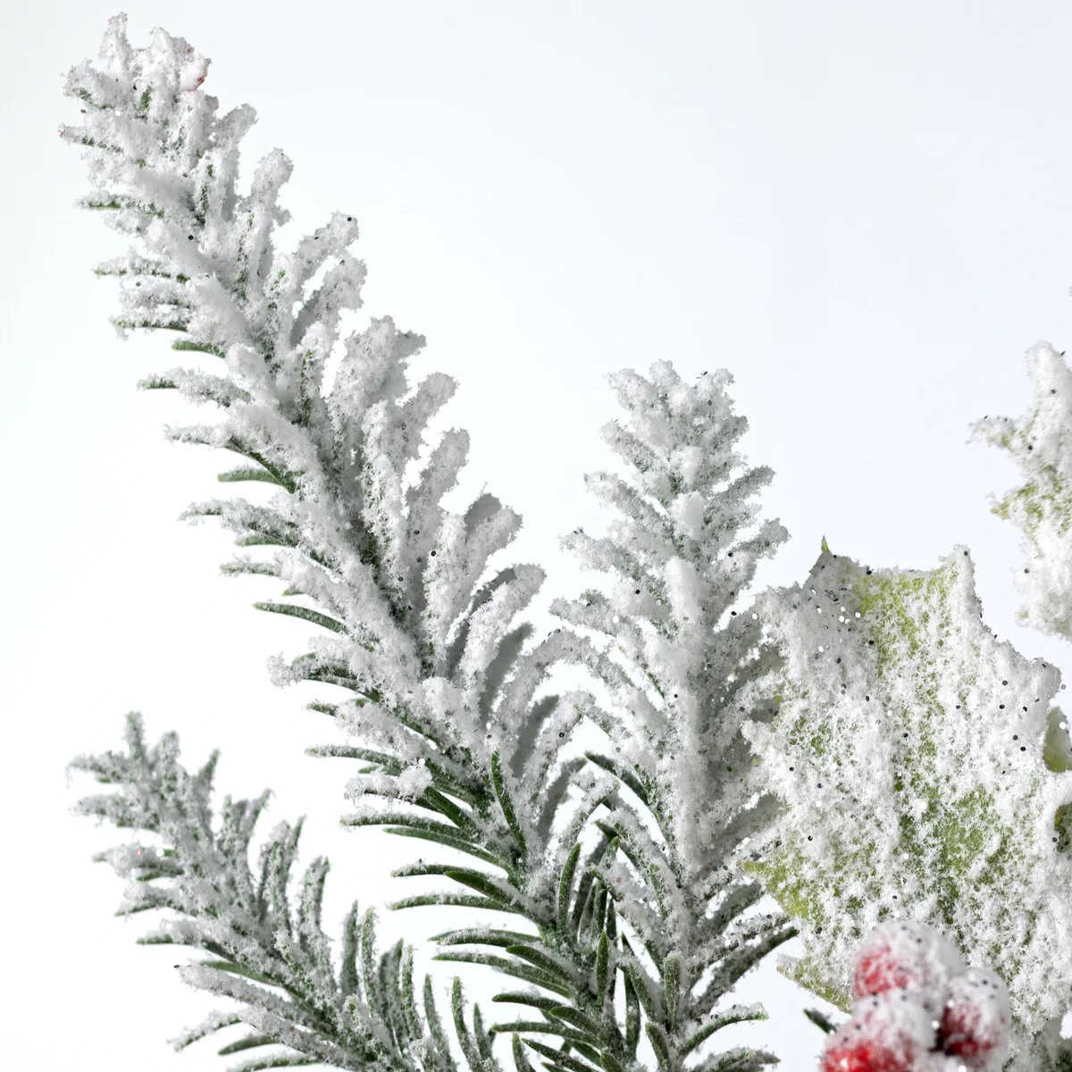 Bring a touch of winter charm to your arrangements with this flocked evergreen pick. Frosted pine, holly leaves, and bright red berries create a classic holiday mix that's perfect for filling vases, adding to wreaths, or tucking into garlands. Its compact size makes it an easy accent for tiered trays, centerpieces, and seasonal displays.