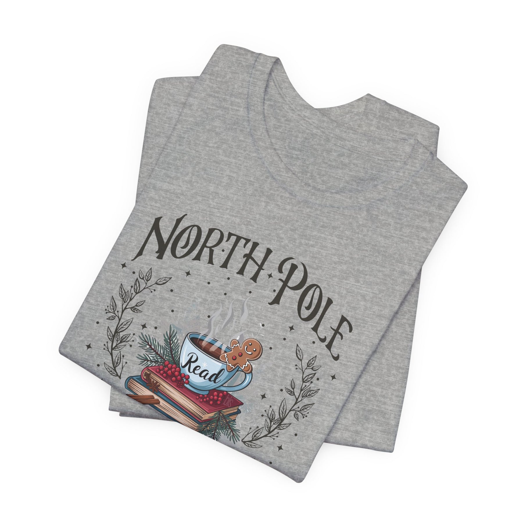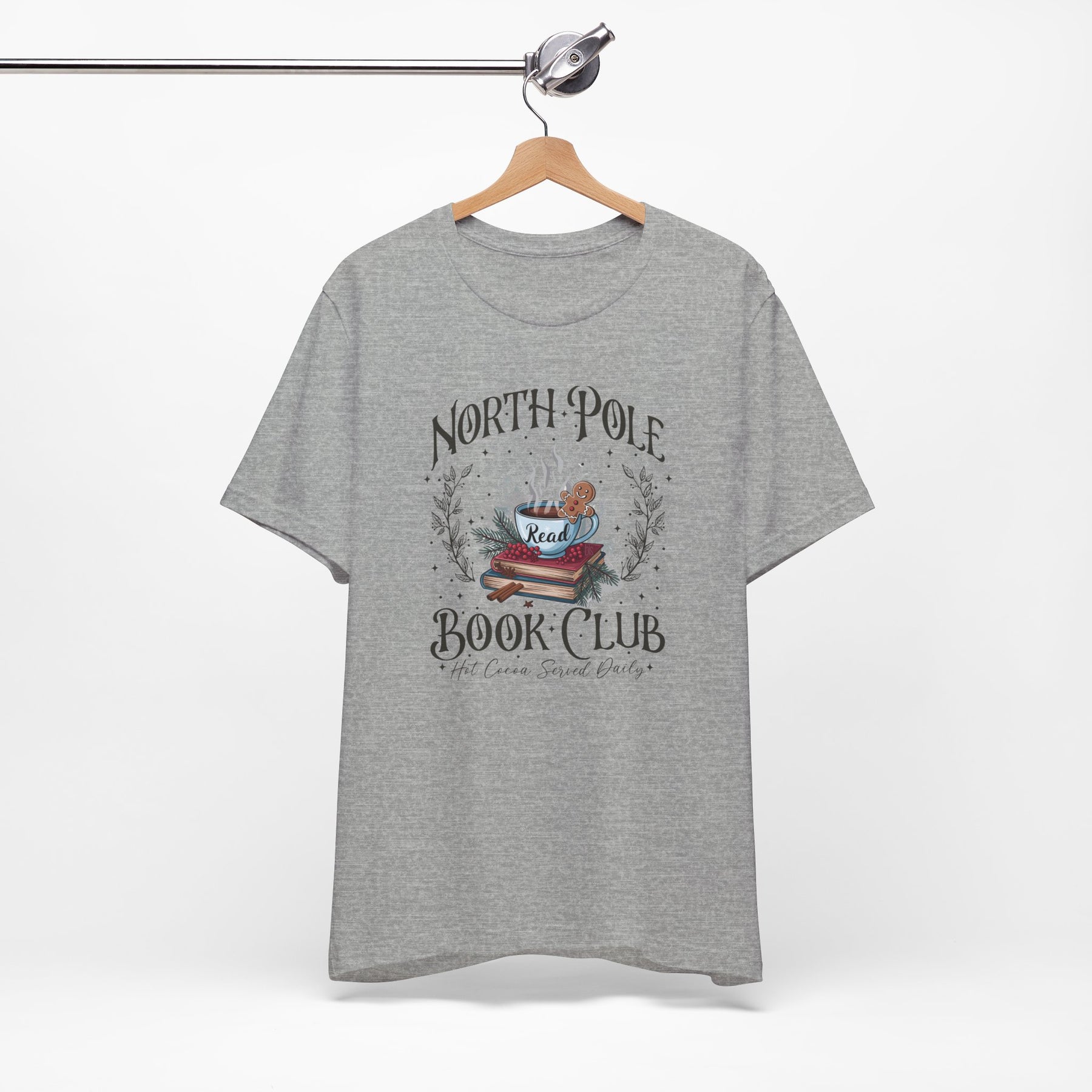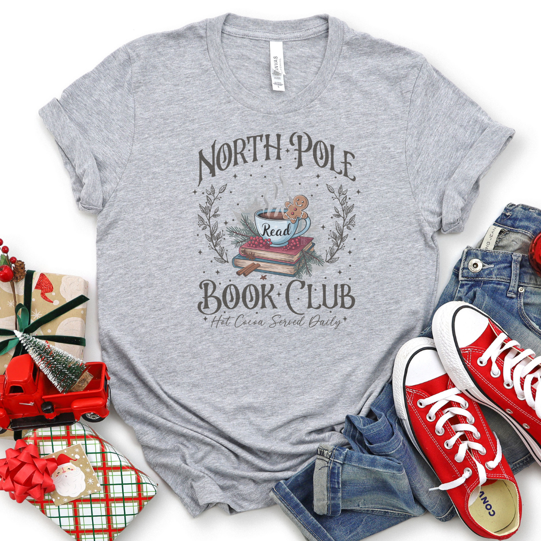 Celebrate the coziest part of the holidays with this North Pole Book Club tee. Featuring a stack of books, a steaming cup of cocoa, and a tiny gingerbread friend, itβs the perfect design for readers who love a little Christmas magic. Soft, comfy, and easy to layer with flannels or cardigans, this shirt brings festive charm to relaxed winter days. Unisex, true to size fit.