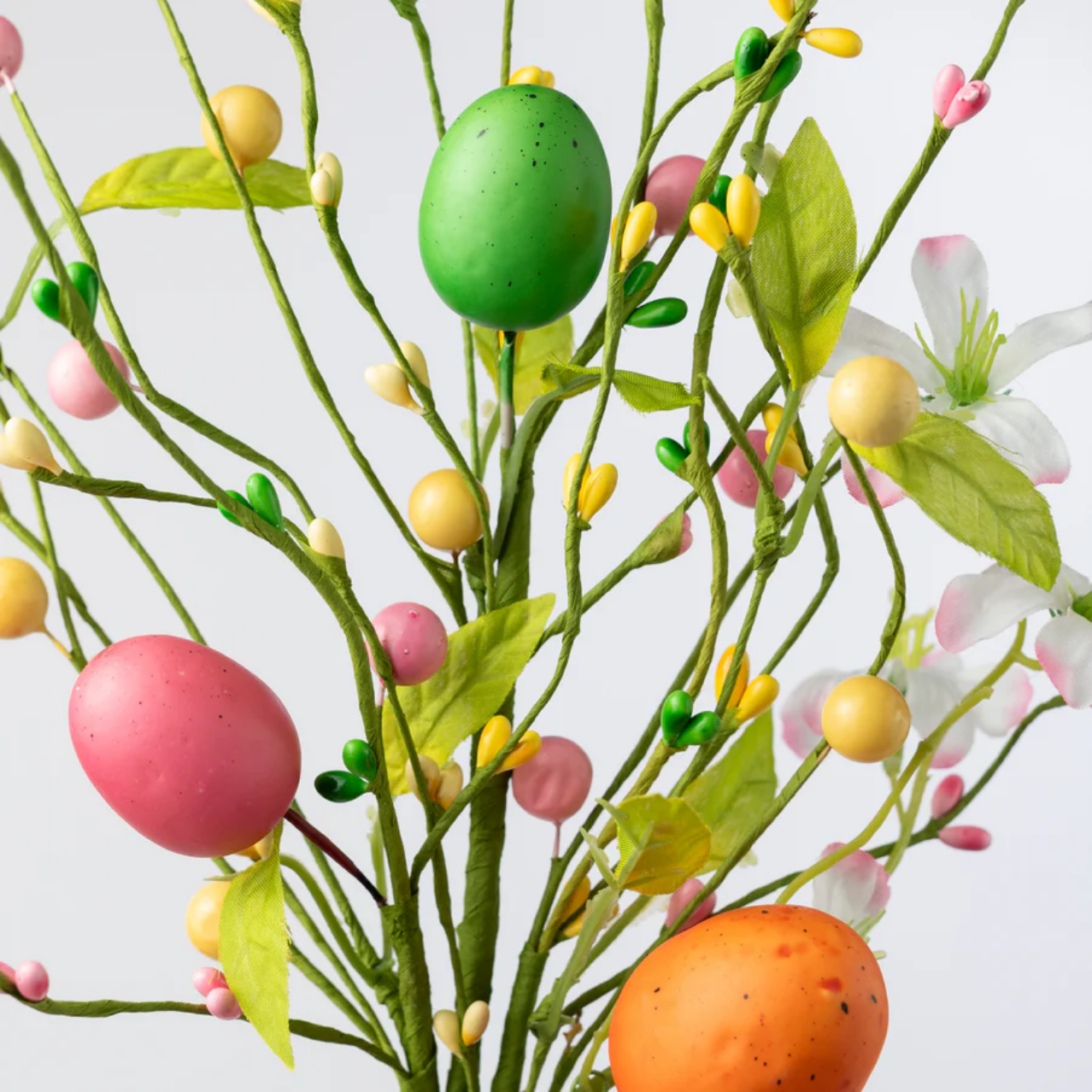 This pick is just the ticket for easily adding bright colors to an Easter design. It has a a plethora of yellow, green and pink pips and berries on wired arms that can be made straight, wavy or curled. Among these pips are pairs of green leaves, white flowers with pink tips, and three speckled eggs. The eggs come in two sizes and are bright pink, green and orange.