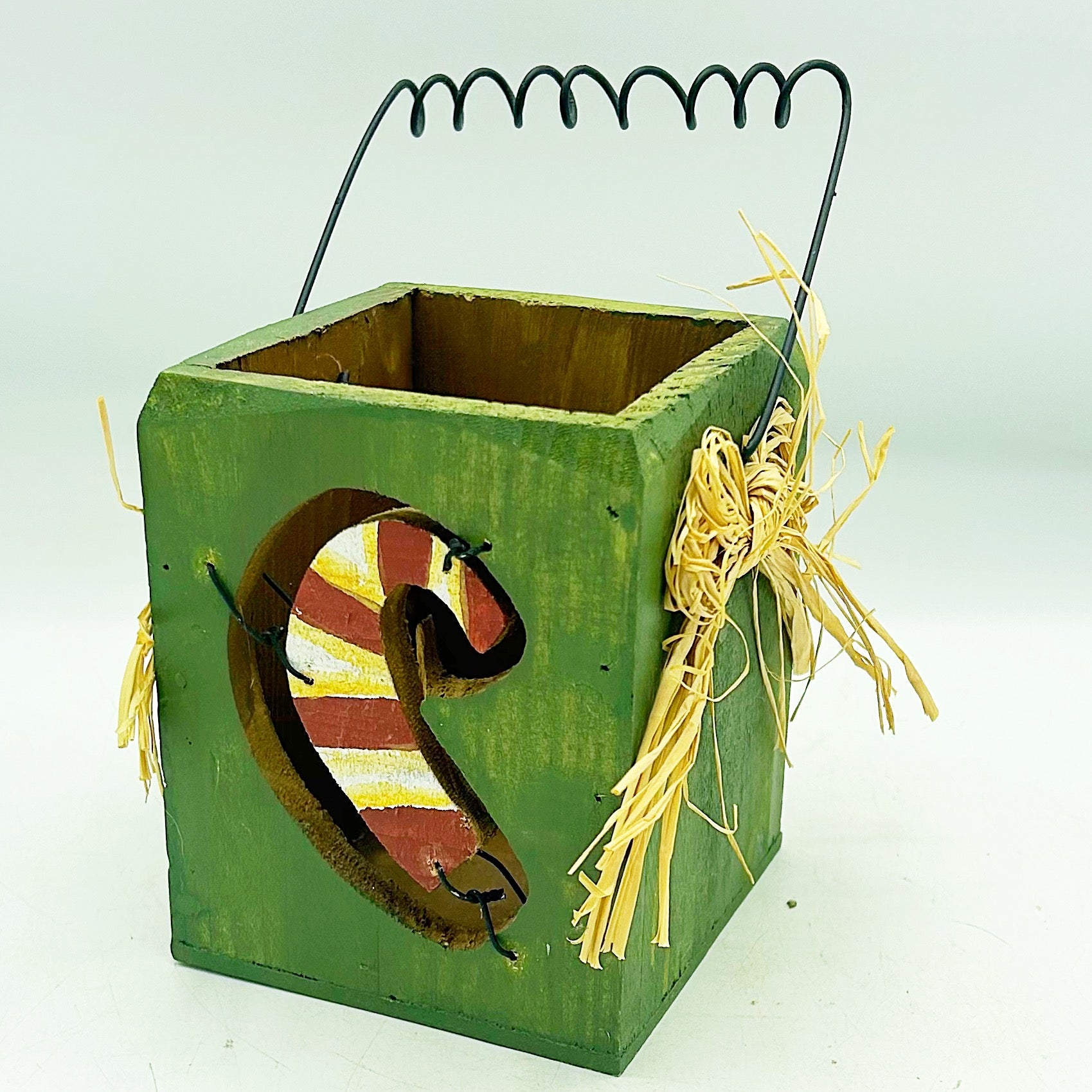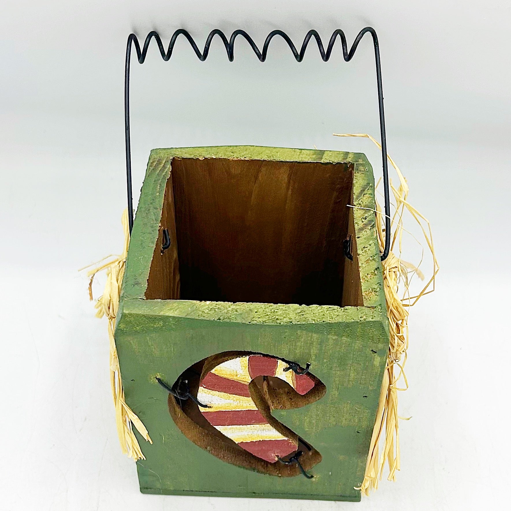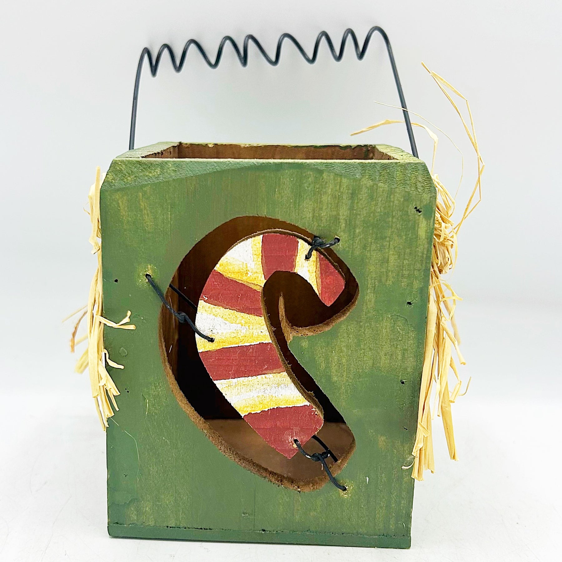 This charming Wooden Candy Cane Box is perfect for storing holiday treats or small trinkets. Its metal handle allows for easy transport, while its primitive style adds a rustic touch to any tabletop.