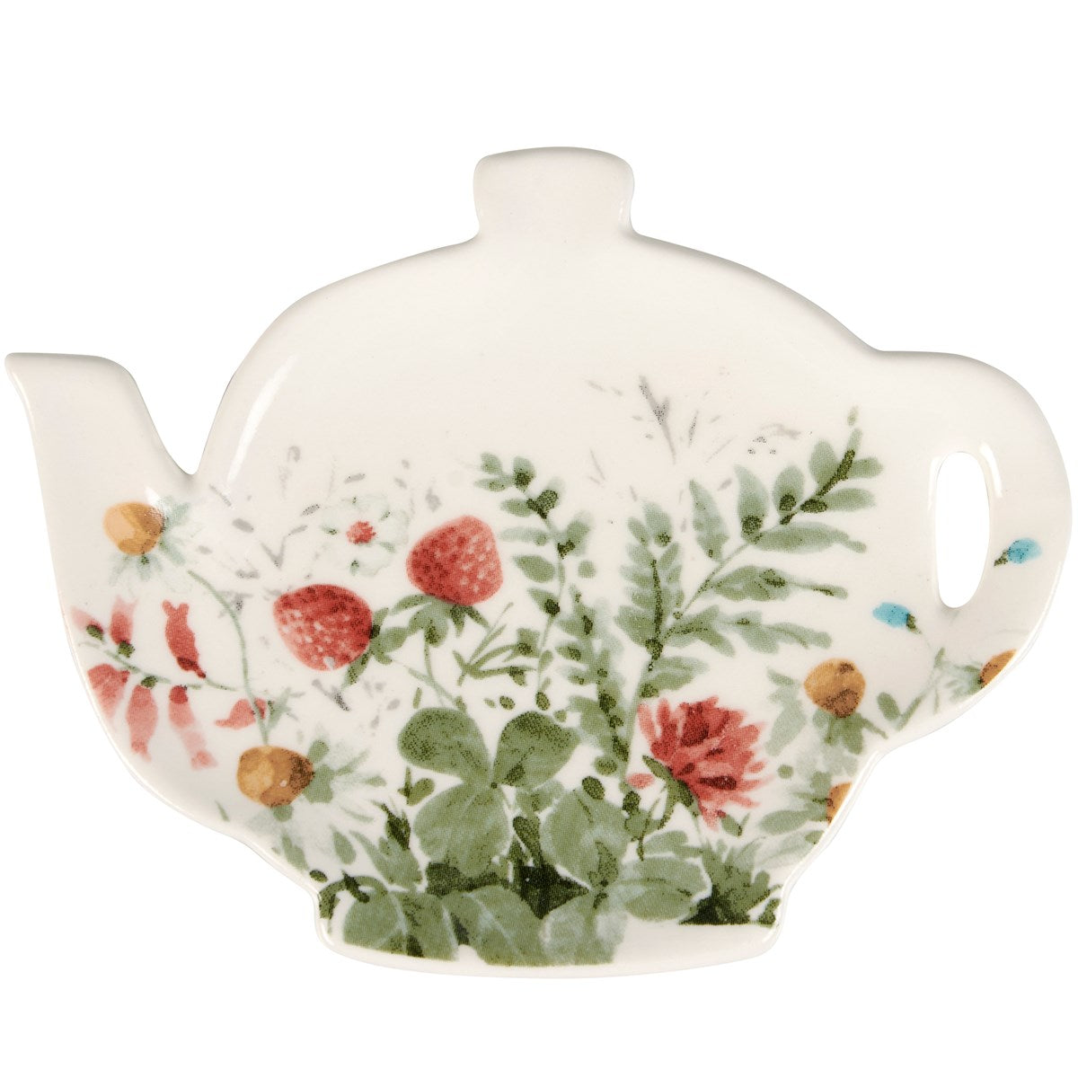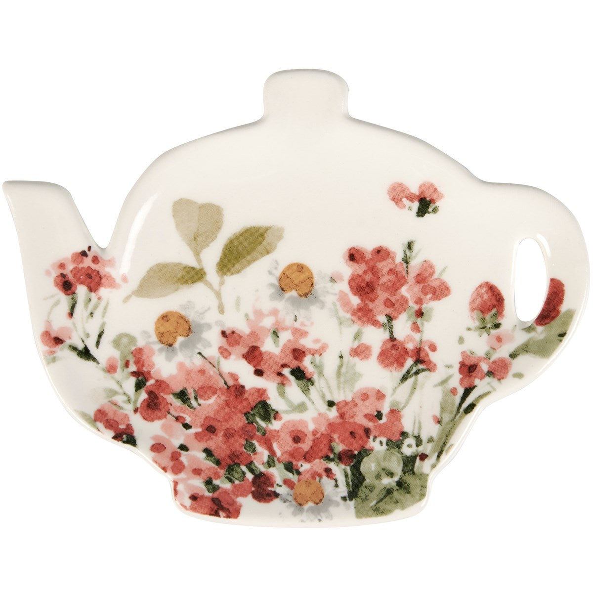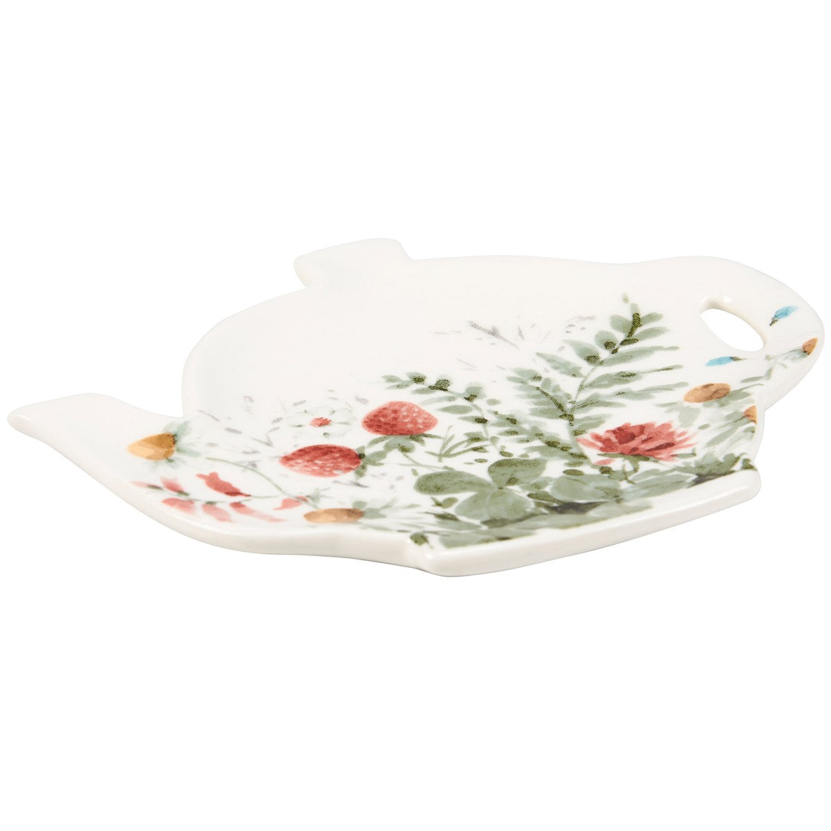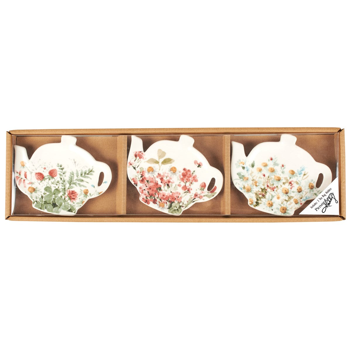 A set of three stoneware tea bag holders from our Tea & Coffee Collection displaying individual hand painted designs on each. Holders feature teapot shape and designs of wildflowers in a delicate watercolor style. Our Florals tea bag holder set is microwave, dishwasher, and food safe for convenient use.