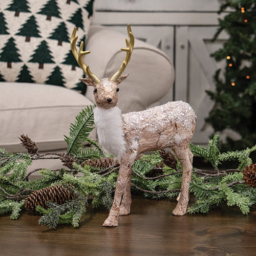 The Sparkle Birch Standing Deer makes a festive farmhouse addition to woodland winter decor. The deer features a textured birch-style finish sprinkled with silver glitter for a snowy look. Soft white faux fur accents the deer's chest, and the antlers are finished with metallic gold color. The deer is freestanding for stable display on a flat surface.