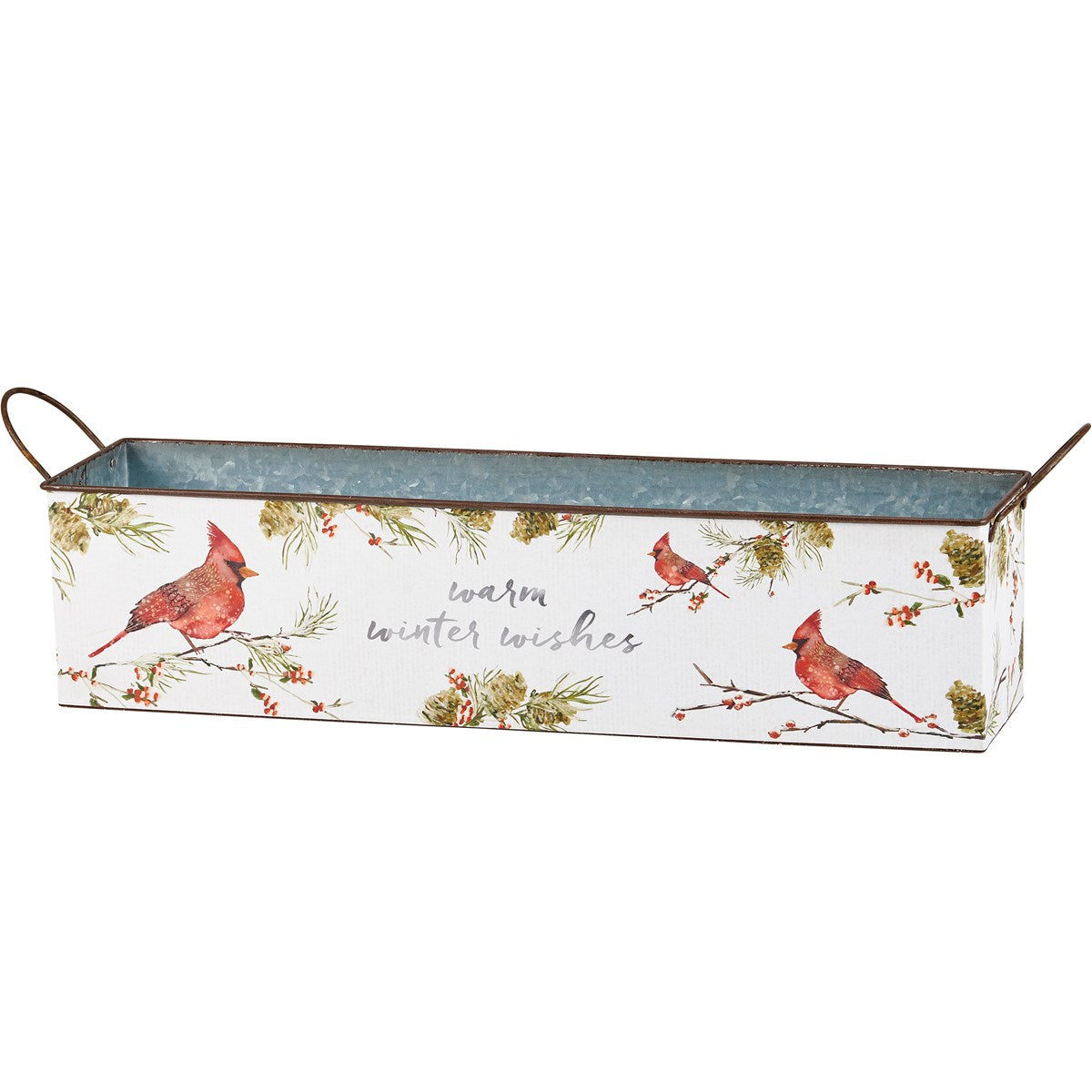 A galvanized metal bin set from our Christmas Collection including two different sized rectangular bins with metal handles on the sides that can nest within each other for easy storage. Each bin displays hand painted winter themed designs in a watercolor style. Larger bin displays a wrap-around design of cardinals on winter branches with "Warm Winter Wishes" sentiment on the front. Smaller bin displays a wrap-around design of birds on winter branches with "Winter Blessings" sentiment on the front. Our Warm Winter Wishes bin set is for decorative use only and is not food safe. Greenery shown is not included. A charming seasonal home accent with a variety of display options.