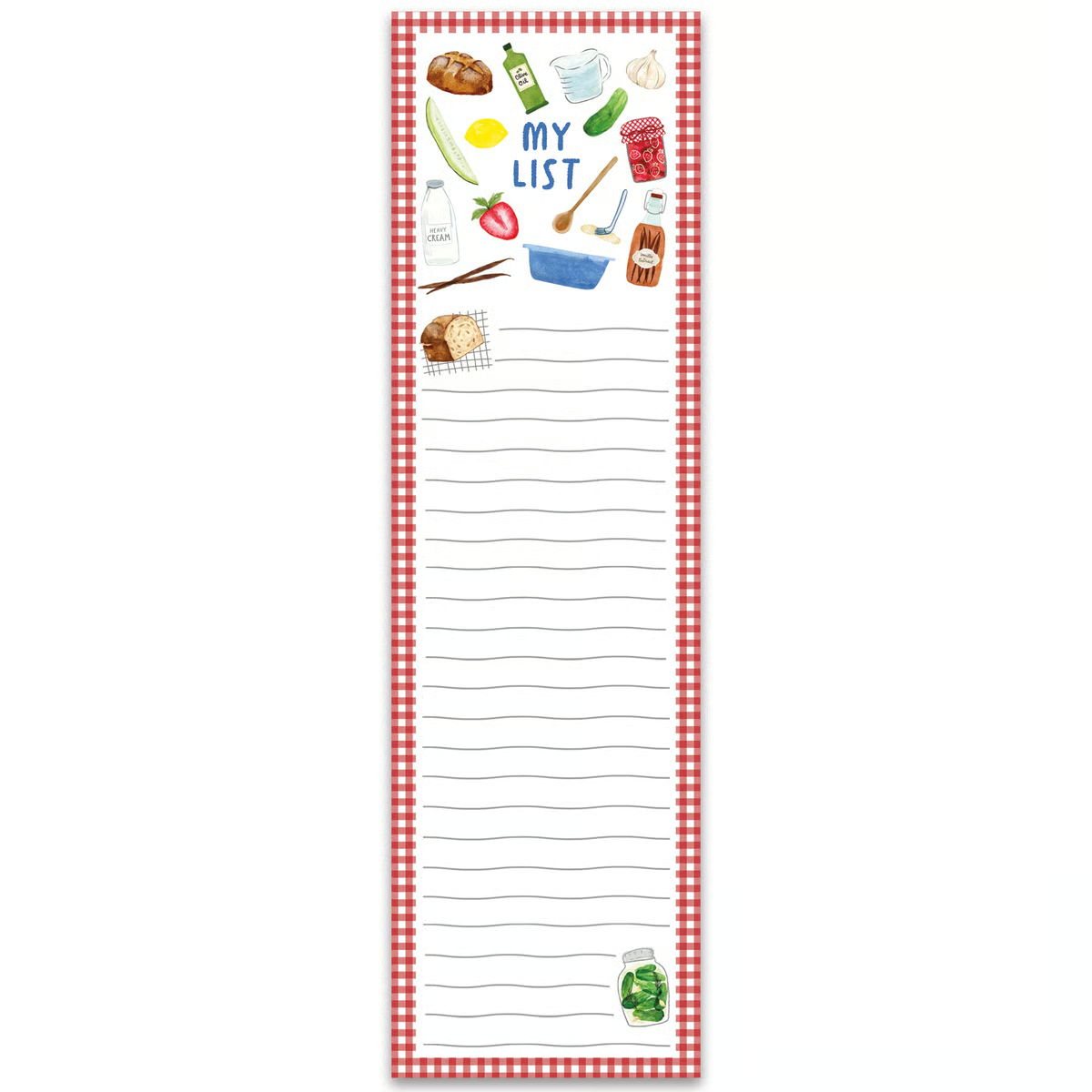 A list notepad from our Homestead Collection displaying charming hand illustrated designs of kitchen ingredients around a "My List" sentiment with a decorative lined space for writing. Our My List pad includes 60 pages and a strong magnet to easily hang on magnetic surface for display. Proudly made in the USA. A fun homestead-themed gift perfect for adding functional style to any space.