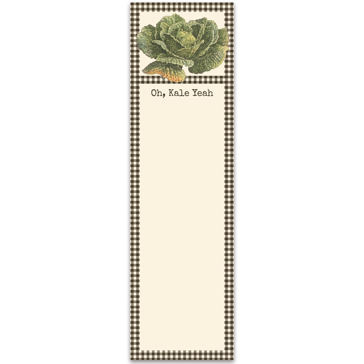 A list notepad from our Garden Collection displaying a vintage design of kale and black gingham pattern around writing space with a fun garden-themed pun that reads "Oh, Kale Yeah." Our Oh, Kale list pad includes 60 pages and a strong magnet to easily hang on magnetic surface for display. Proudly made in the USA.