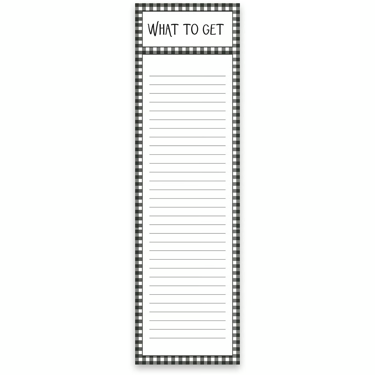 A list notepad from our Room By Room Collection displaying a black and white design with "What To Get" sentiment and lined space for writing. Includes 60 pages and a strong magnet to easily display on magnetic surface. Our What To Get list pad is proudly made in the USA.