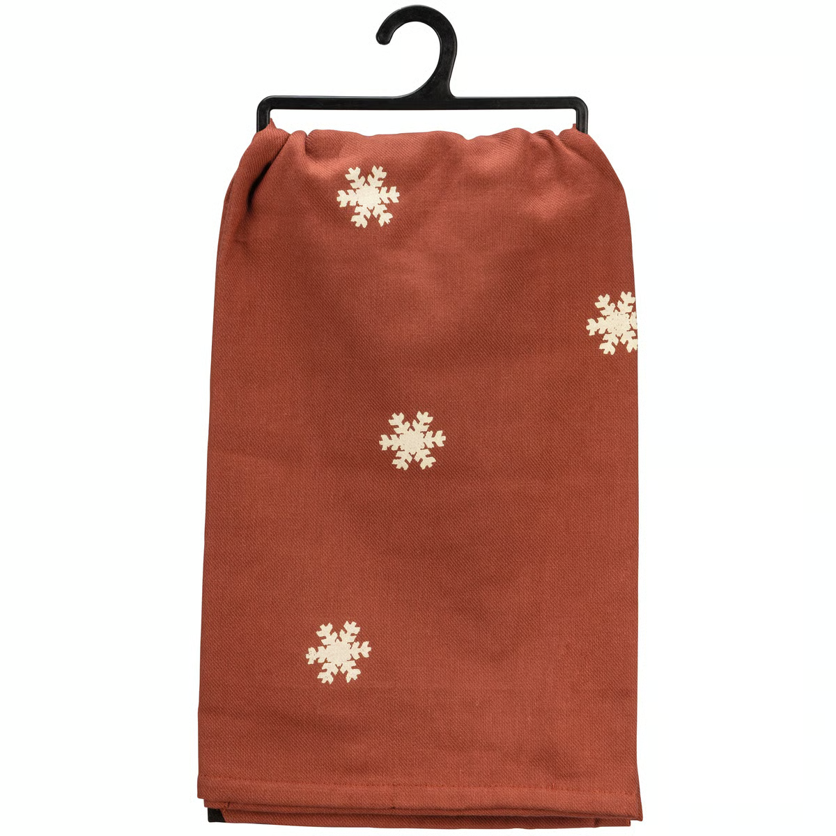 A rustic-inspired kitchen towel lending an "Every Cookie You Bake Every Ornament You Make I'll Be Watching You" sentiment. Features a block print cat with plaid bowtie and snowflake designs throughout. Machine-washable.