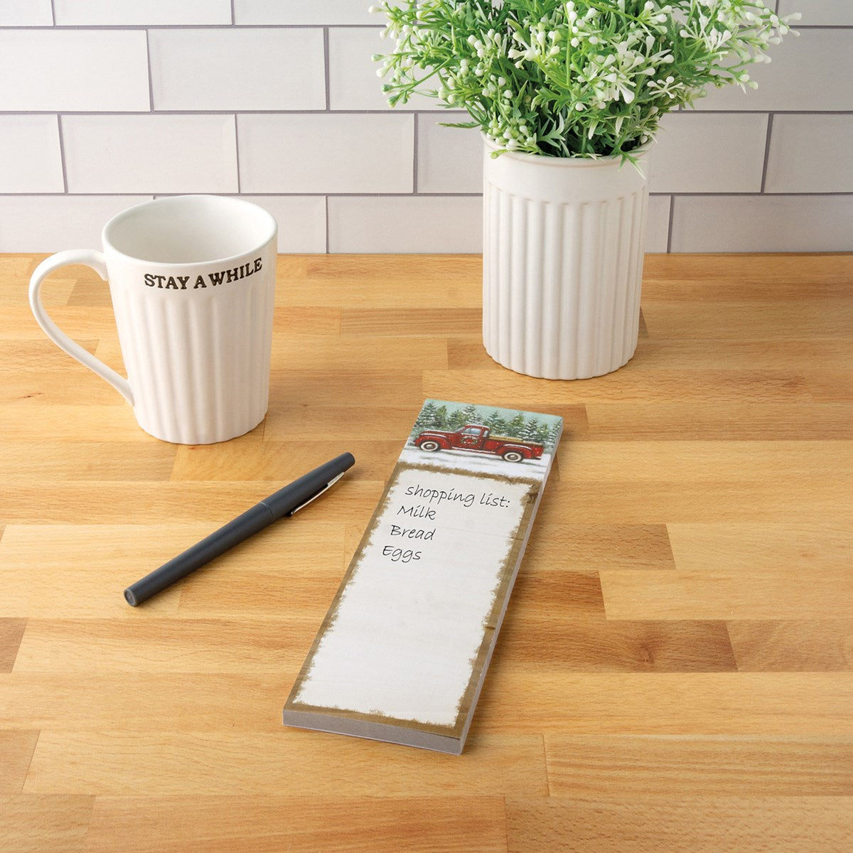A list notepad featuring a wintry red truck design. Design is replicated from original artwork painted onto burlap canvas, giving the art a unique depth and texture. List notepad includes 60 pages and strong magnet.