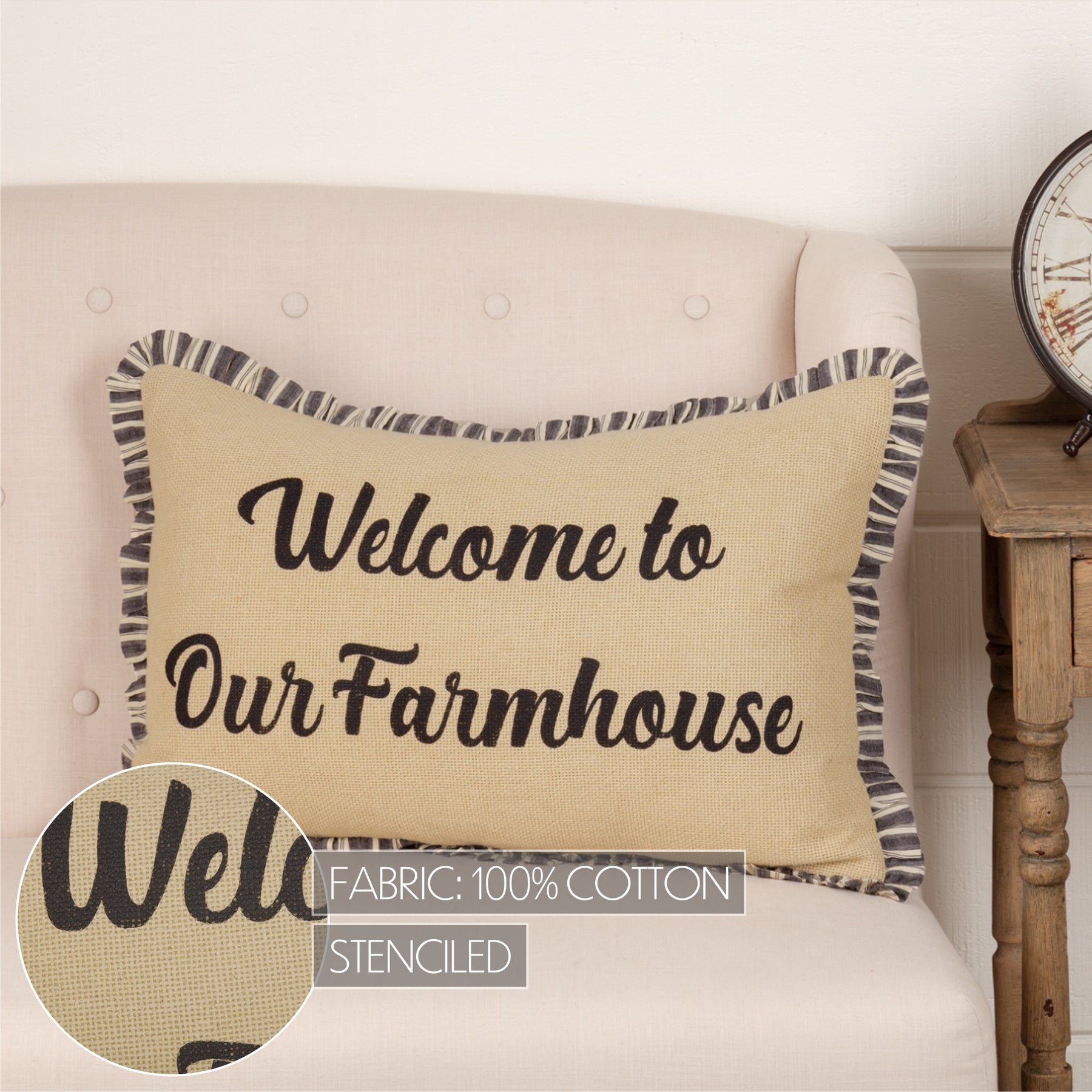 Texture meets farmhouse charm with this versatile 14x22 inch decorative accent pillow. The Ashmont Burlap Vintage Welcome to Our Farmhouse Pillow features a natural burlap front and a striped seersucker back with neat, ruffled edging. The warm tan of the soft burlap provides a base for deep black stenciled word art reading, "Welcome to Our Farmhouse" in an elegant script. The removable rustic pillow cover is made from 100 percent cotton and includes polyester fill. Includes button style closures for easy cleaning. Pair this modern farmhouse throw pillow with other accent or foundational pieces from the Ashmont Collection for a casual modern farmhouse look. Add to a sofa or chair for a cozy lumbar pillow. Machine washable and iron safe.