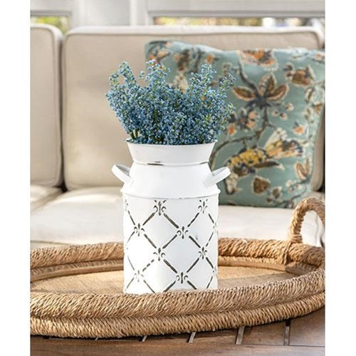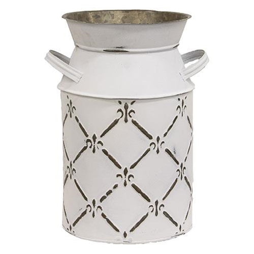 The Whitewashed Fleur De Lis Milk Can is a decorative container made of galvanized metal. The can has a clean white finish and features two rounded handles, as well as a raised criss-cross pattern with fleur de lis emblems. Fill this can with florals and greenery for a lush tabletop or shelf display. Container is not water tight, be sure to use a liner if adding water.