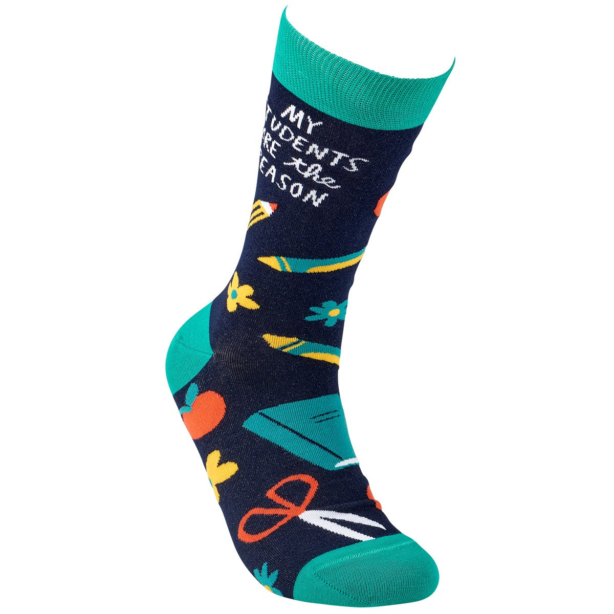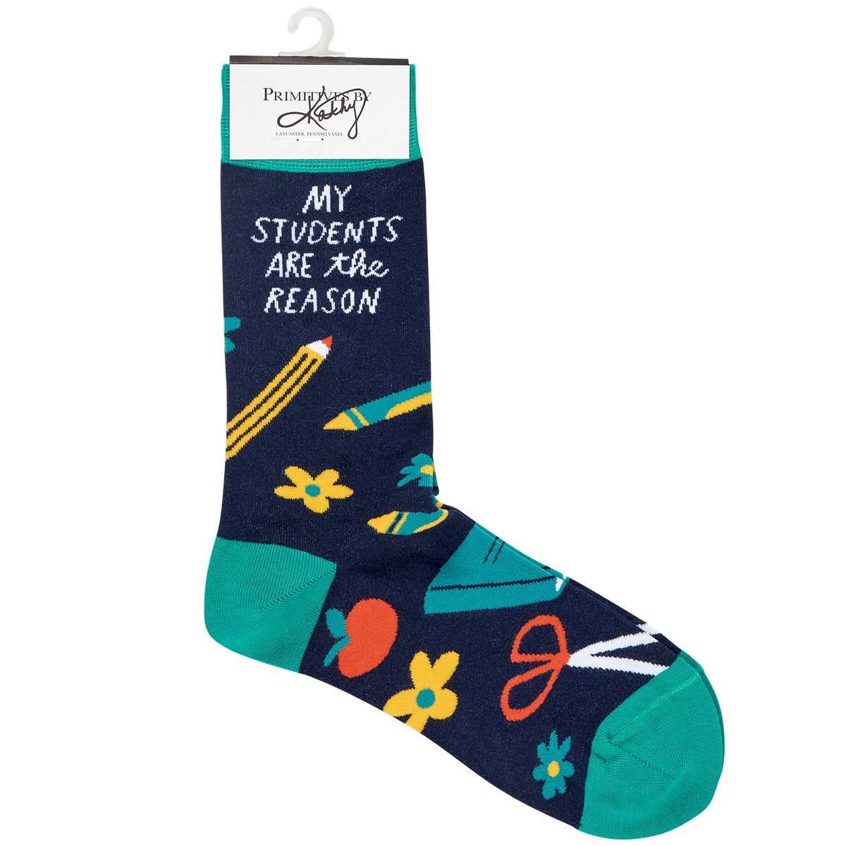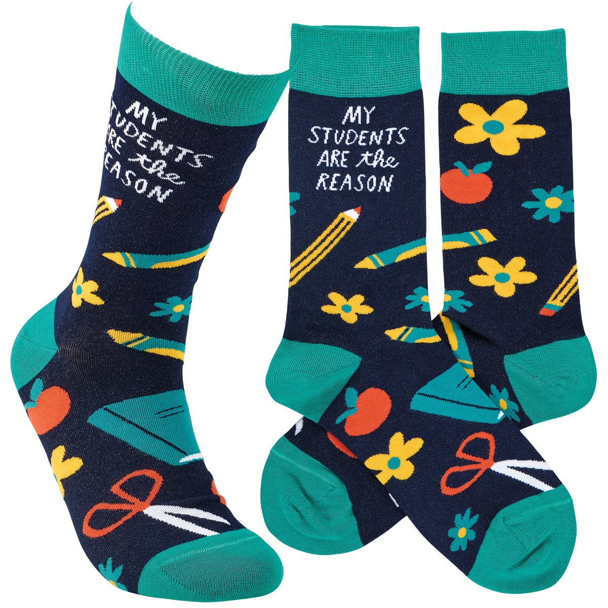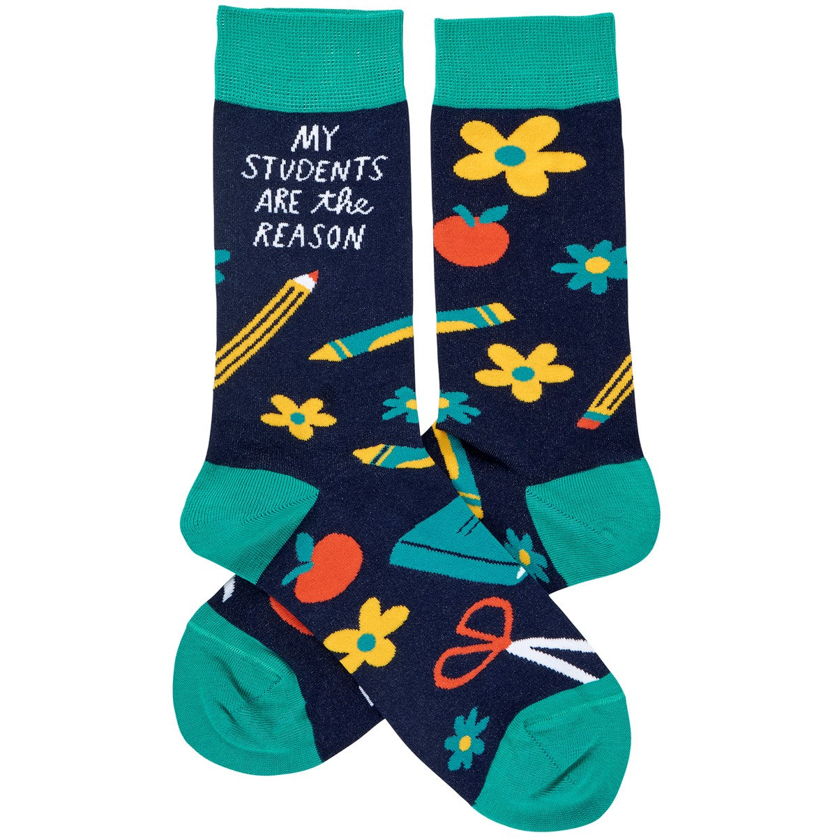A pair of colorful socks from our Teacher Collection displaying vibrant hand illustrated designs of flowers and classroom objects with an inspirational teacher-sentiment that reads "My Students Are The Reason." Socks feature a one size fits most design made with cotton, nylon, and spandex.
