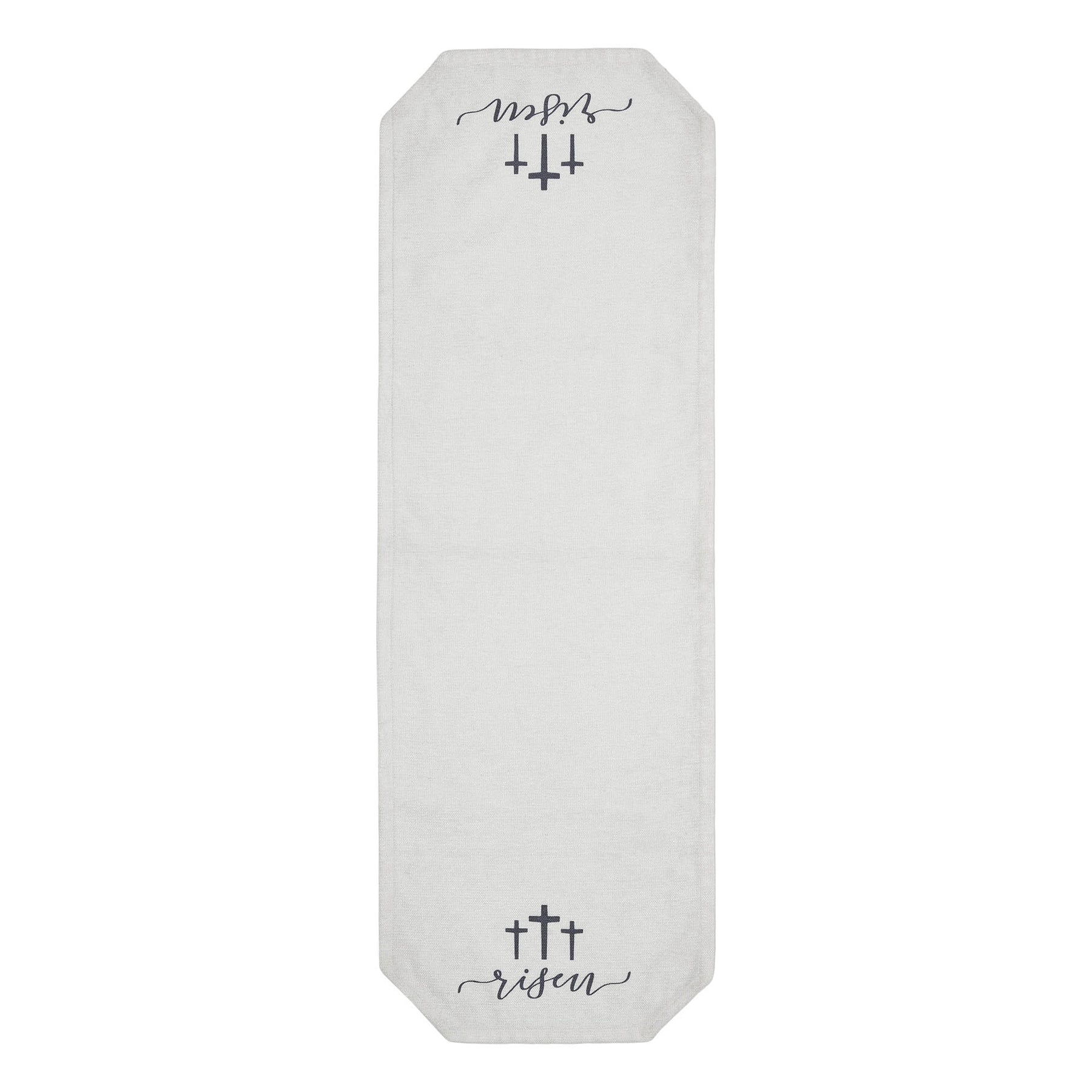 Elevate your farmhouse or country-style dining room and kitchen with the Polyester Runner 12x36. This charming table runner, adorned with a delicate digital print of three crosses and proclaiming "Risen" from the Risen Collection, adds a touch of rural charm to your space. Crafted from soft white polyester, it creates a warm and inviting atmosphere, making it an ideal choice for those who appreciate fine country accents.