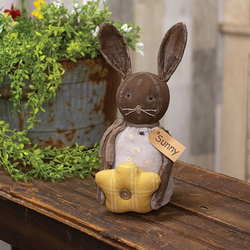 Sunny Bunny Doll is a decorative plush doll made with primitive spring style. The bunny doll has a distressed finish and features flexible wired ears. The doll wears a light gray floral dress, rustic scarf, and brown paper name tag that reads, "Sunny." He holds a yellow flannel stuffed flower complete with a button center. A weighted base allows for freestanding display on a flat surface.
