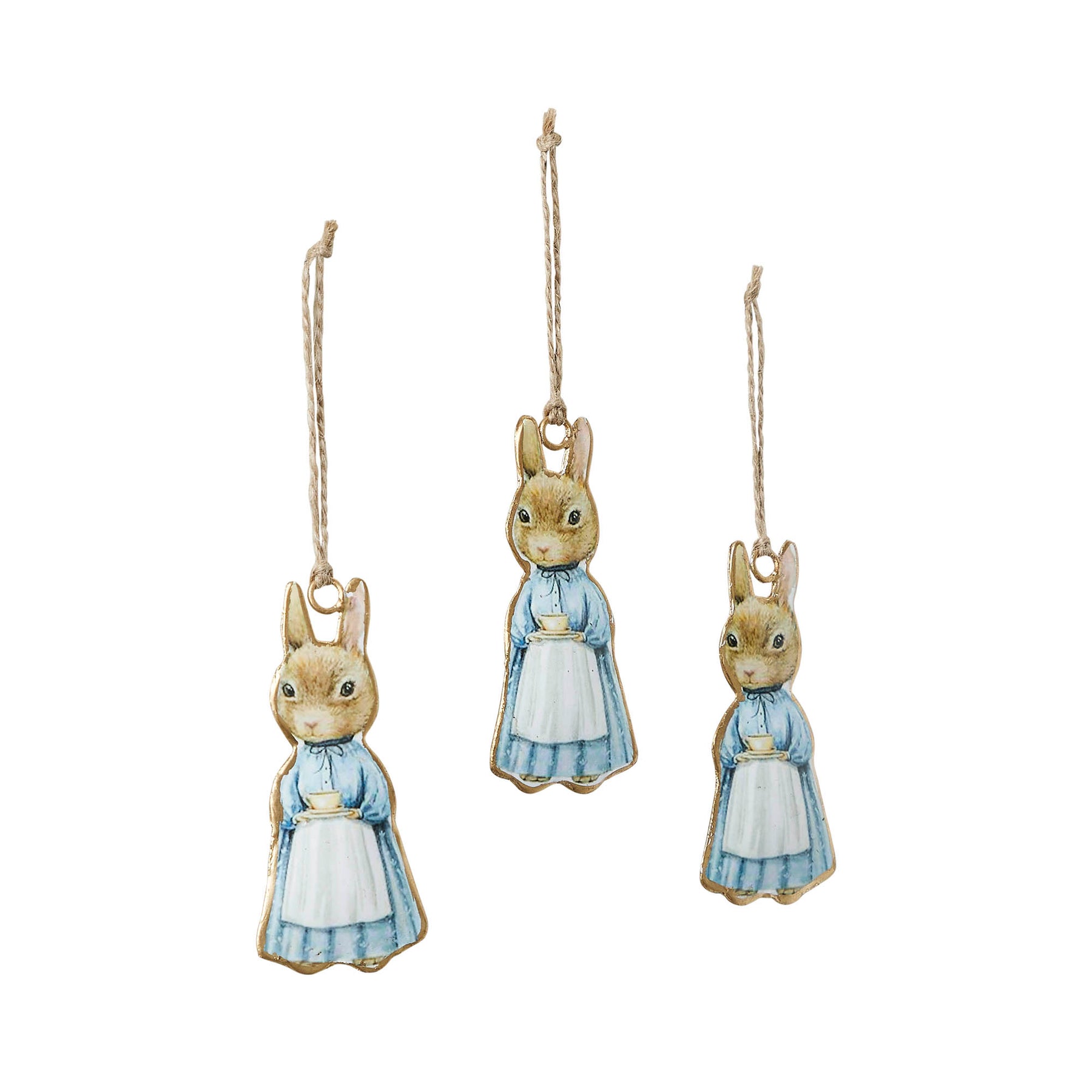 This set of 3 bunny rabbit ornaments features sweet vintage-style designs with each bunny dressed in a blue dress and apron. Made of metal with jute hangers, they bring a charming farmhouse touch to Easter trees, spring garlands, or rustic displays.